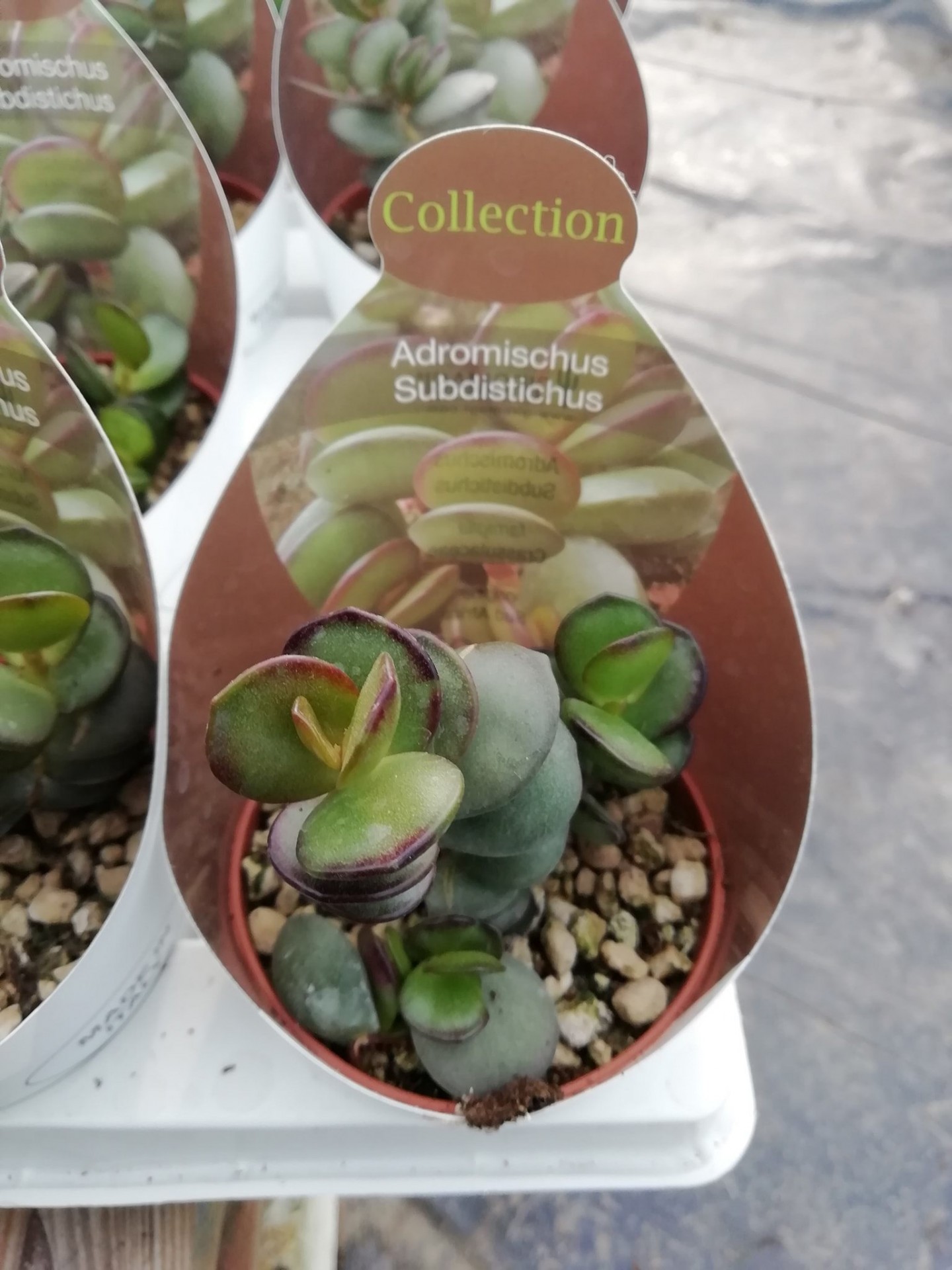 • Planta suculenta Adromischus Subdistichus em vaso com etiqueta Collection