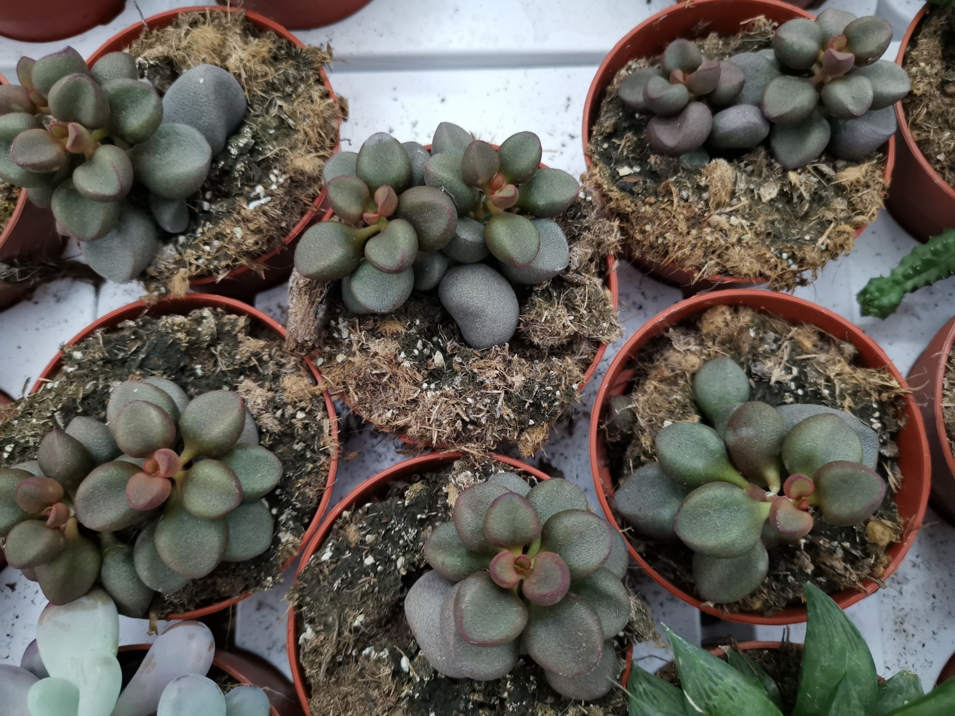 Vasos pequenos com plantas suculentas de folhas arredondadas e carneas em terra com musgo seco