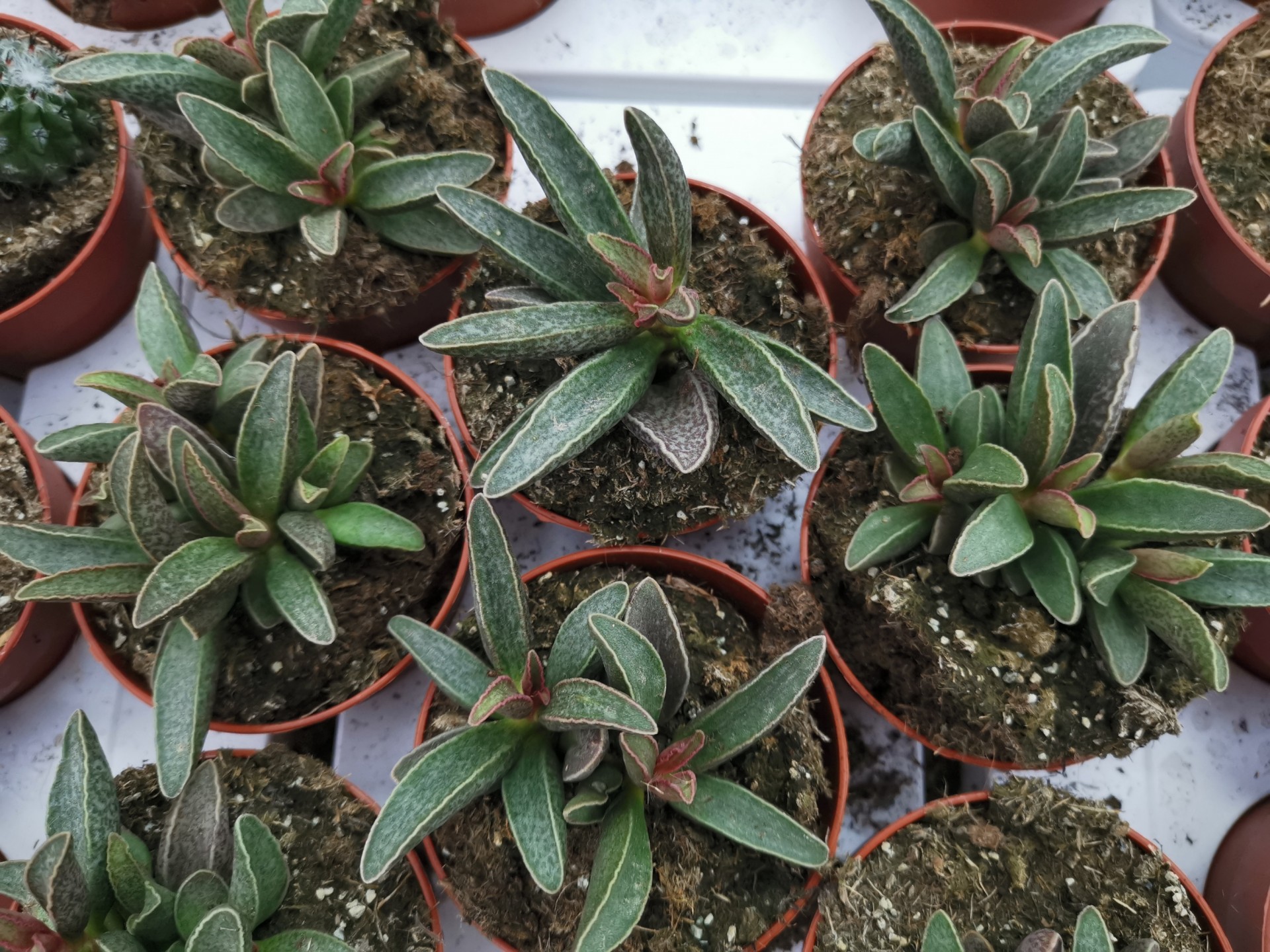 • Conjunto de plantas suculentas em vasos castanhos com terra