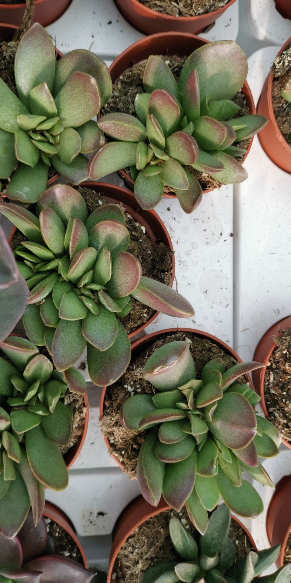 • Plantas suculentas em vasos castanhos sobre superfície branca