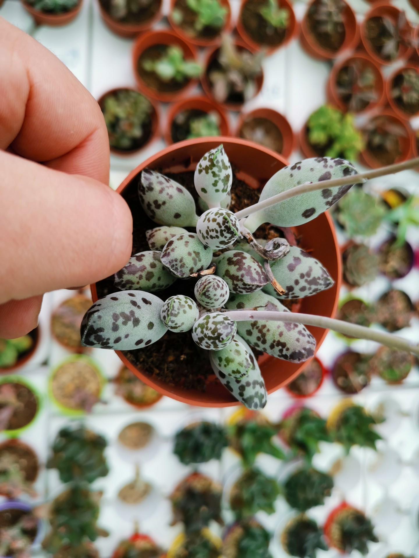 Vaso com suculenta verde clara e manchas roxas sendo segurado por mão, com outras plantas ao fundo