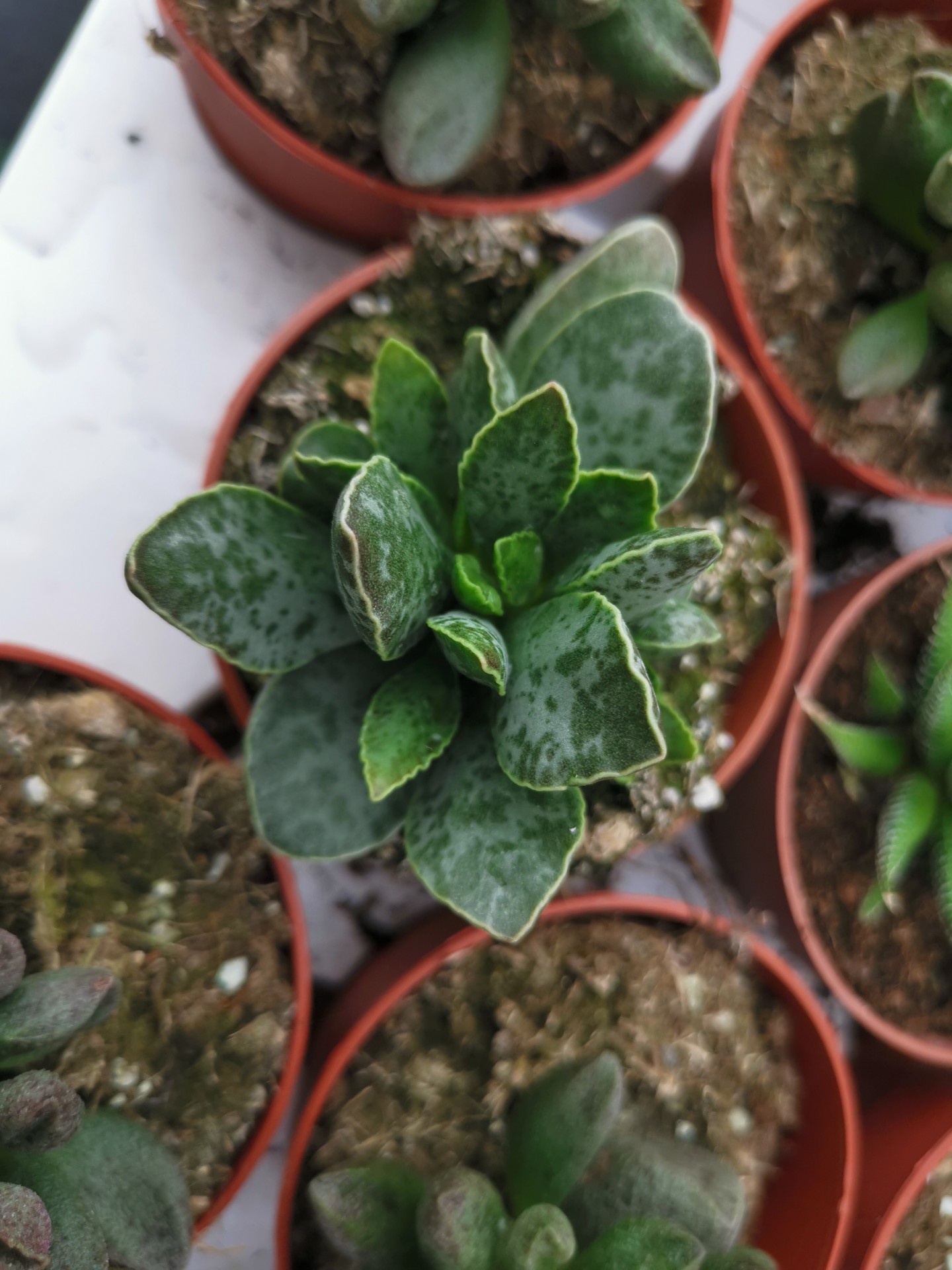 Plantas suculentas em vasos pequenos de plástico castanho