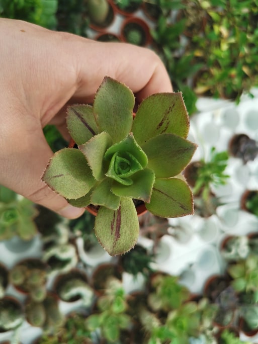 • Planta suculenta verde com manchas escuras em pequeno vaso sendo segurada por mão