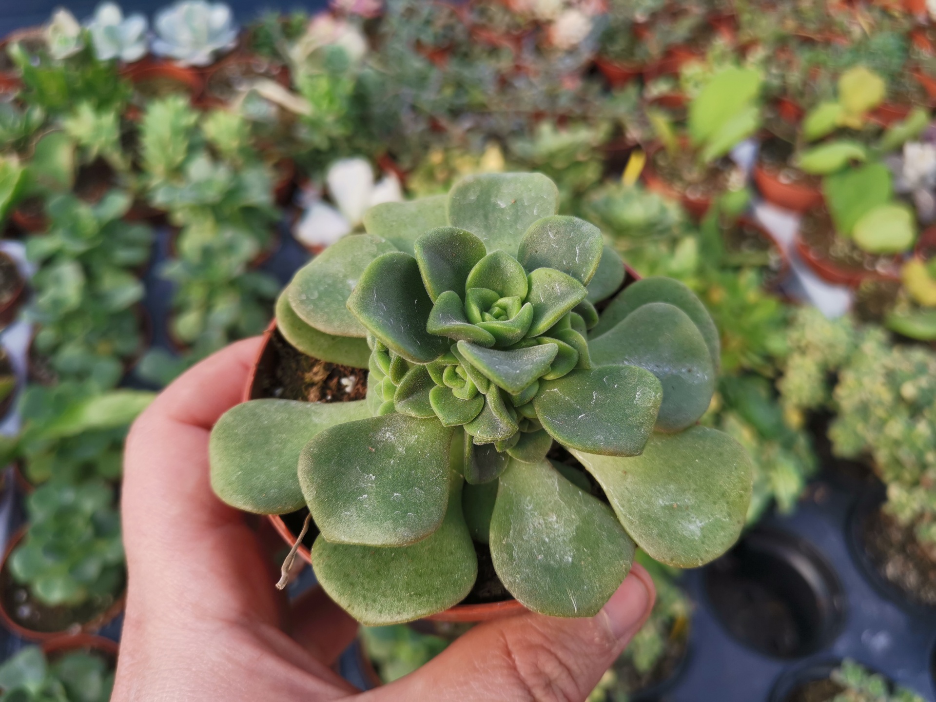 Planta suculenta verde nas mãos com vasos desfocados ao fundo