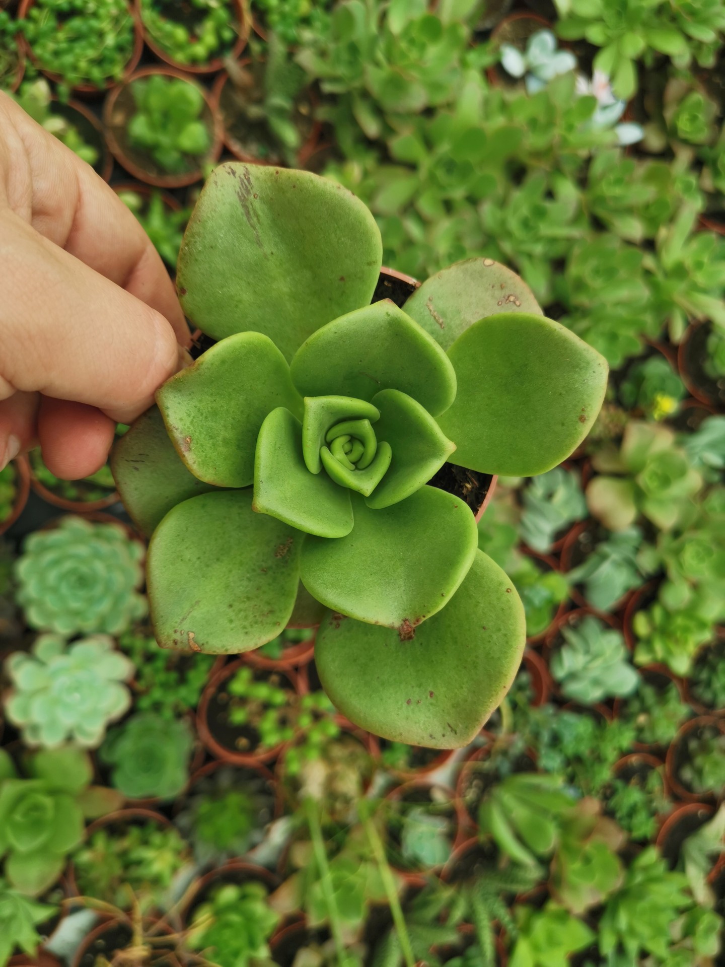 • Suculenta verde com folhas carnudas em vaso pequeno, vista de perto, sobre fundo de várias suculentas.