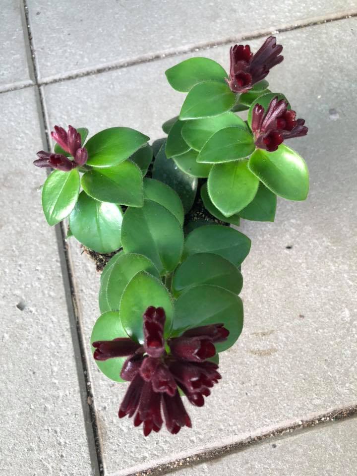 Planta verde com flores vermelho escuro em vaso sobre chão de azulejos.