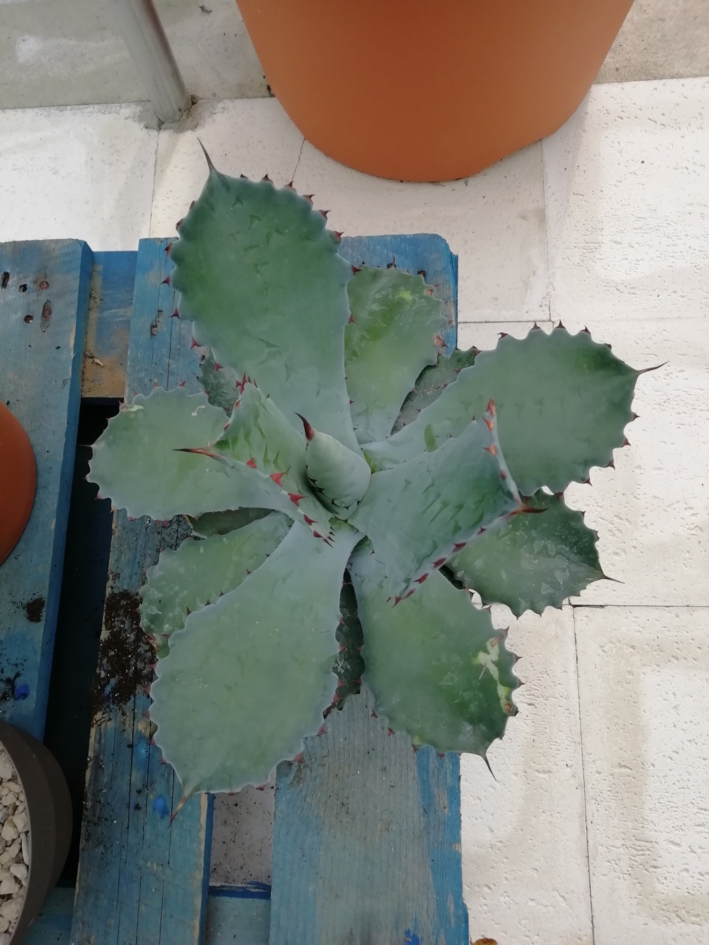 • Planta suculenta verde com bordas espinhosas em palete azul e vasos de terracota