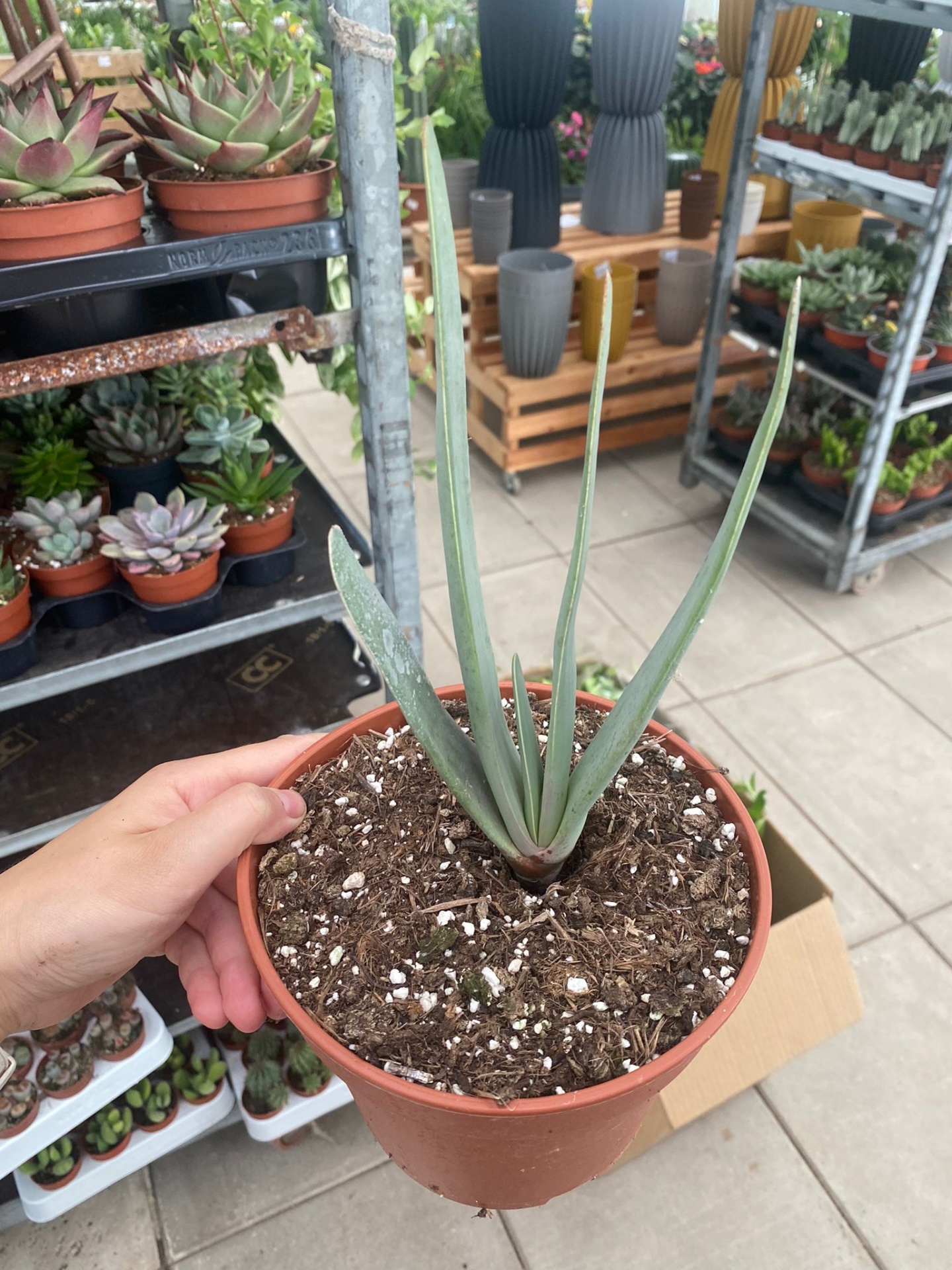 Pessoa segurando vaso de plástico com planta suculenta verde em loja de plantas