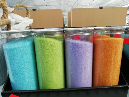 • Quatro copos com areia colorida azul, verde, lilás e laranja em caixa preta