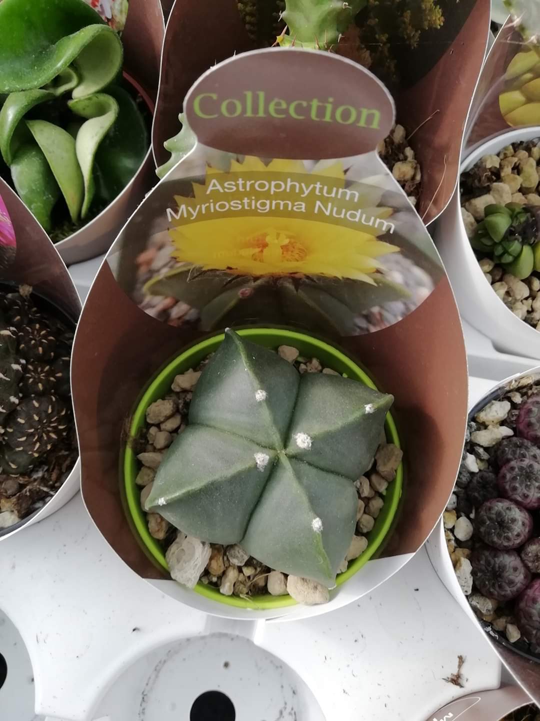 • Cacto verde em vaso pequeno com etiqueta Collection Astrophytum Myriostigma Nudum