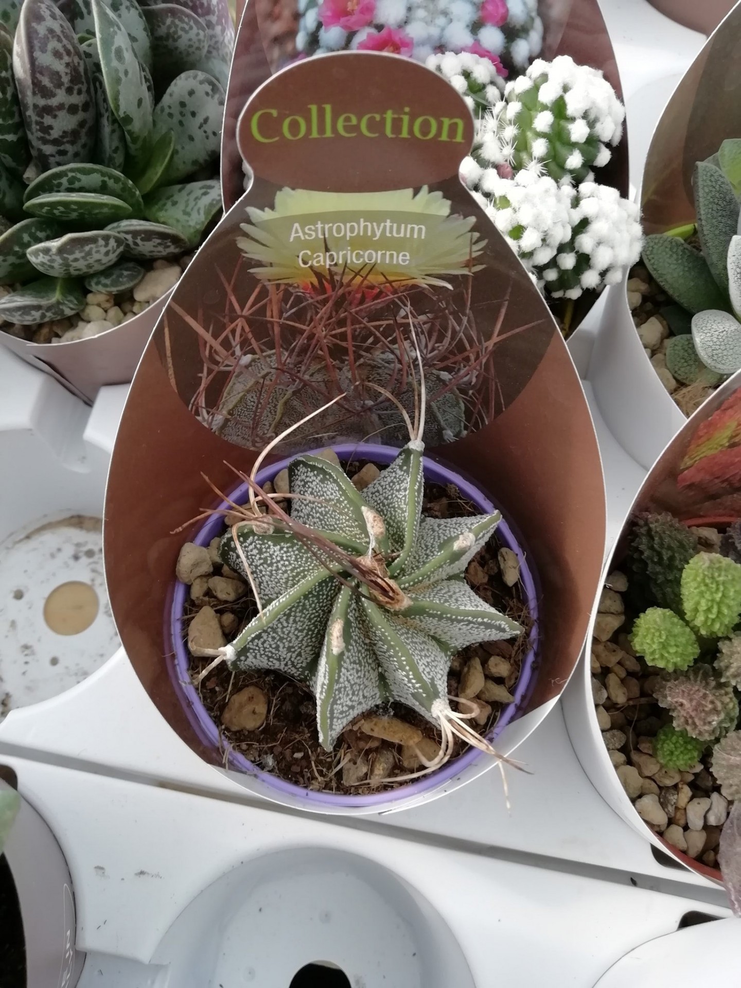Cacto Astrophytum Capricorne em vaso roxo com etiqueta Collection