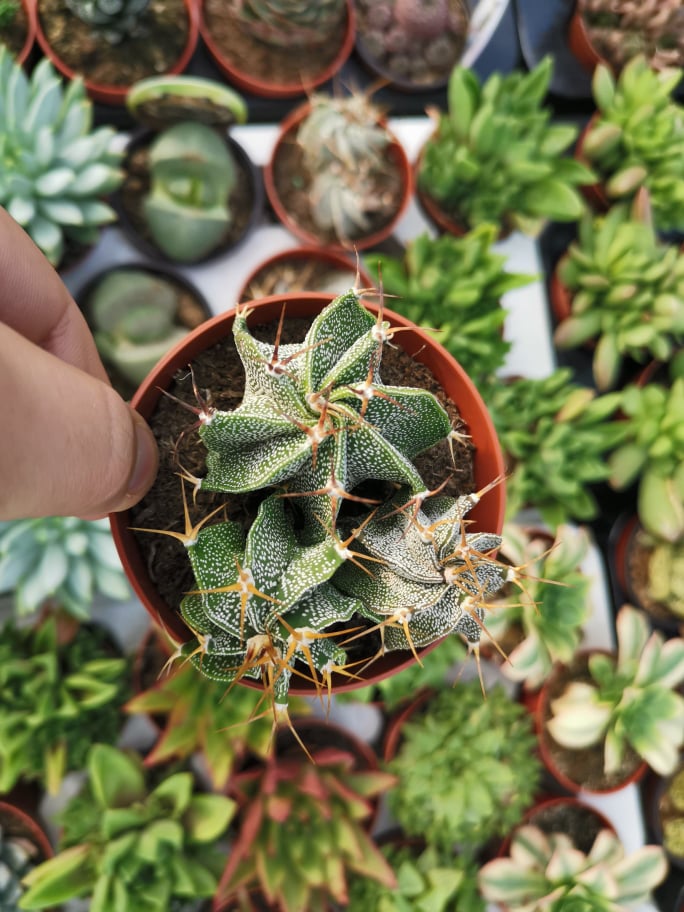 • Pequena planta suculenta verde com espinhos em vaso castanho