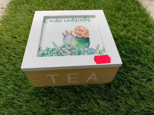 • Caixa de chá de madeira com tampa de vidro e decoração de cacto