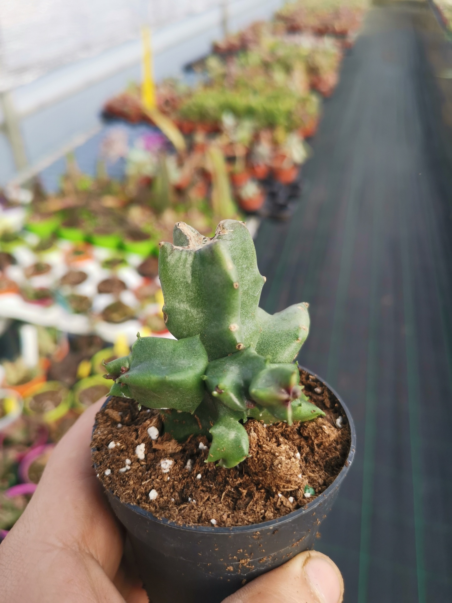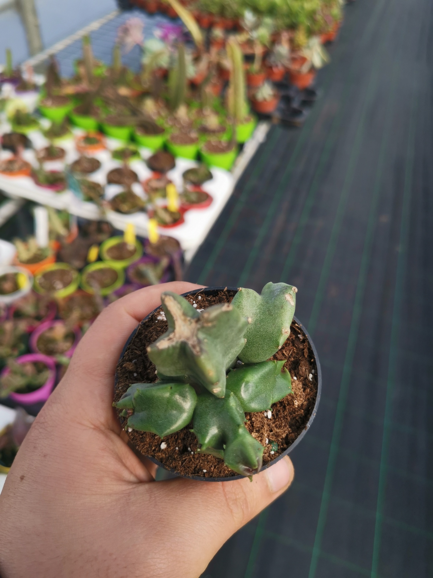 • Planta suculenta verde em vaso preto segura por mão, fundo com várias plantas em vasos coloridos numa estufa
