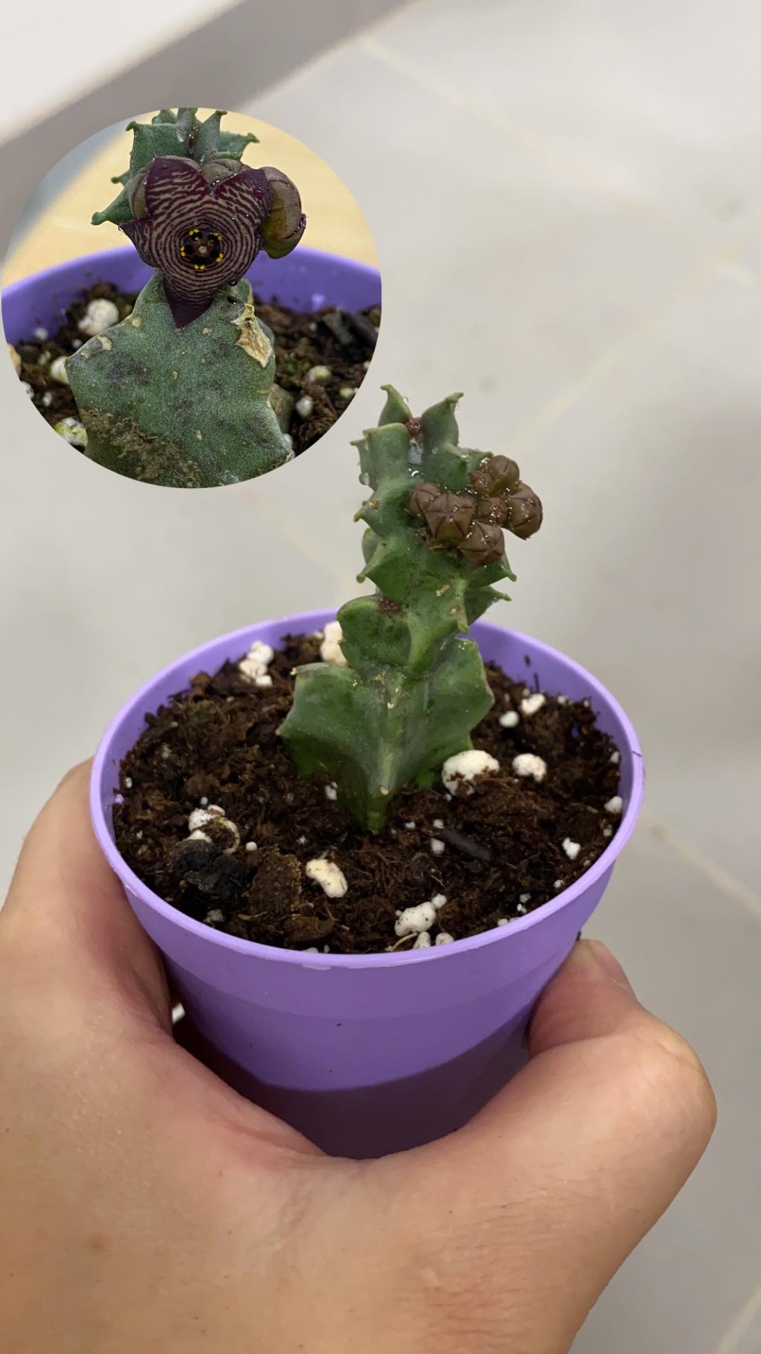 • Planta suculenta verde com flores pequenas marrons em vaso roxo