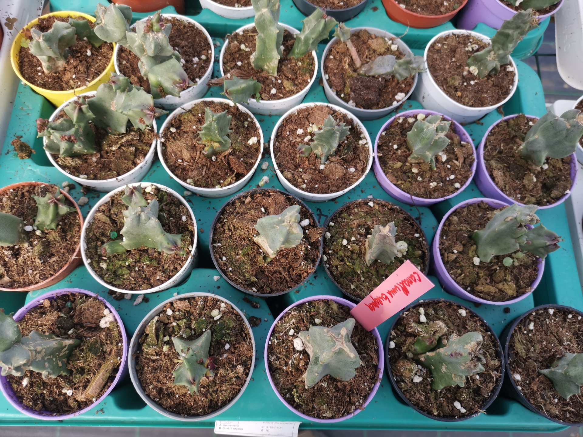 • pequenos cactos em vasos coloridos com etiqueta 'Astrophytum'