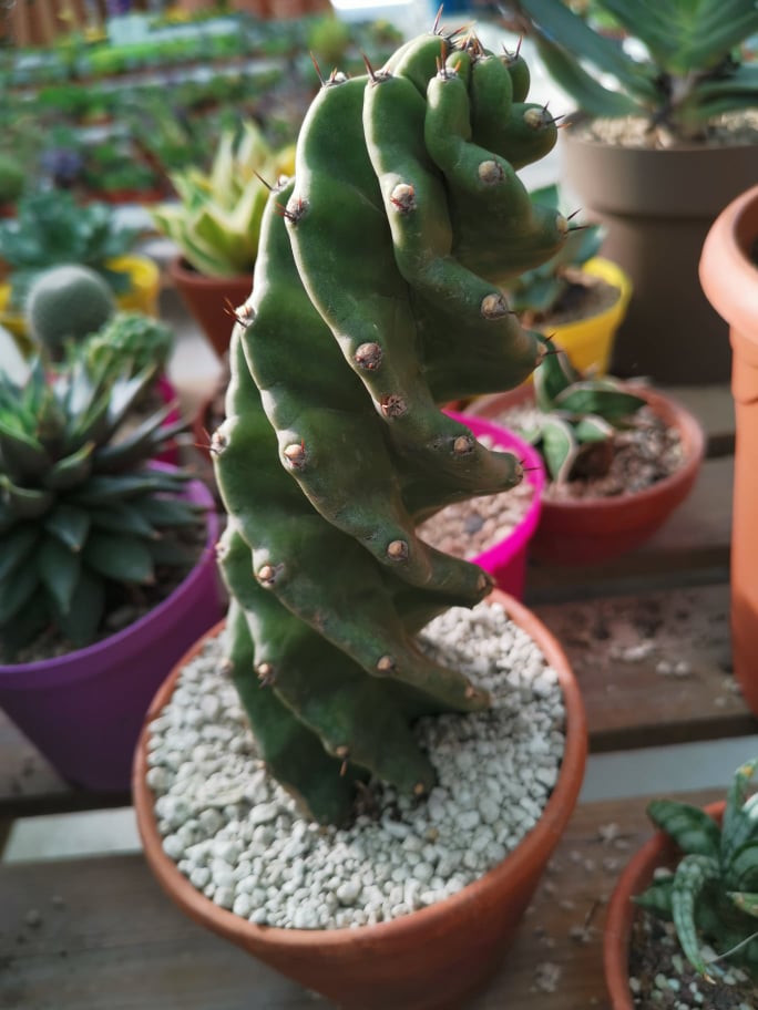Cacto espiral em vaso de terracota com pedras brancas, cercado por outros vasos coloridos com plantas