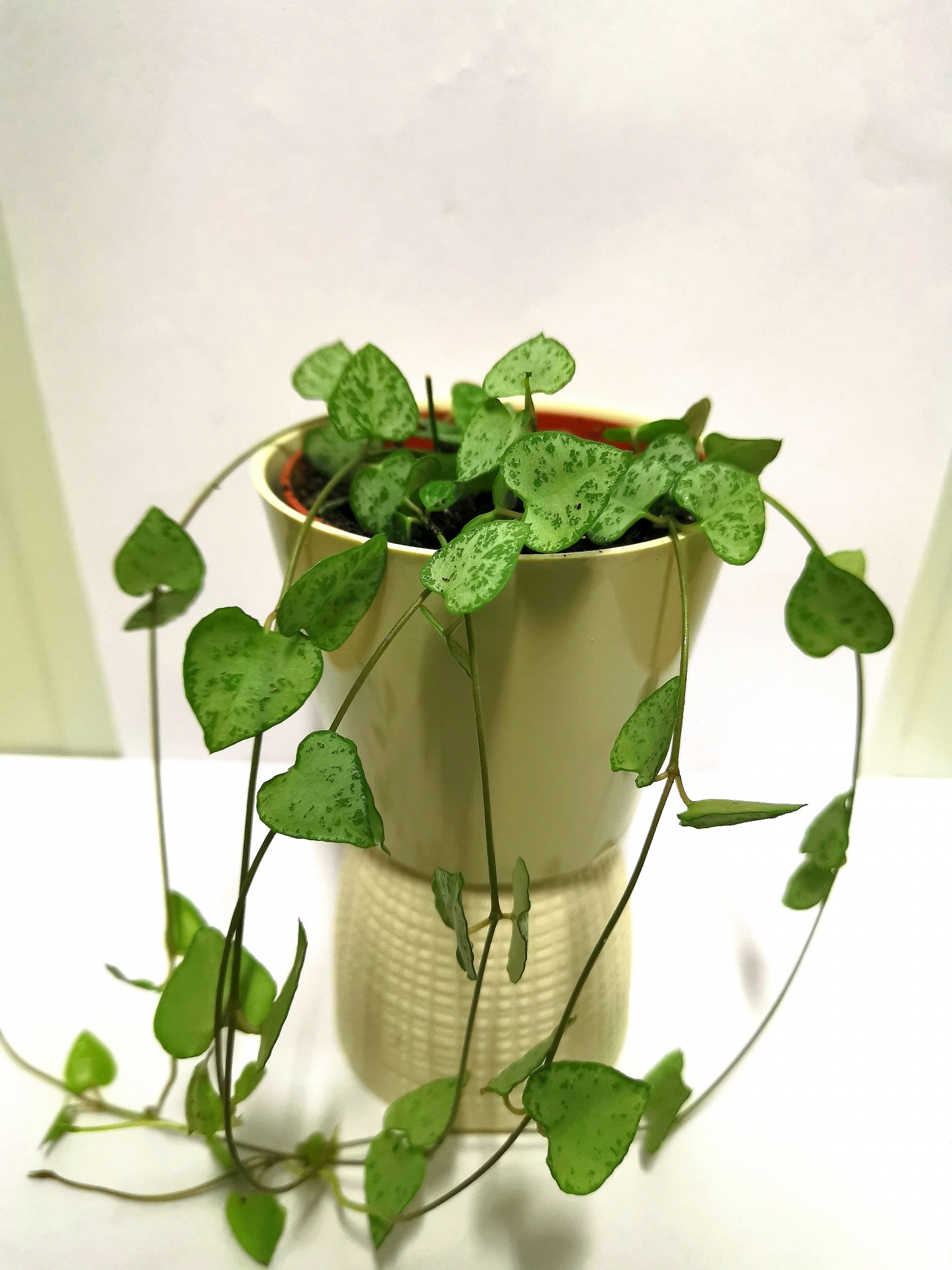 • Planta com folhas em forma de coração num vaso creme
