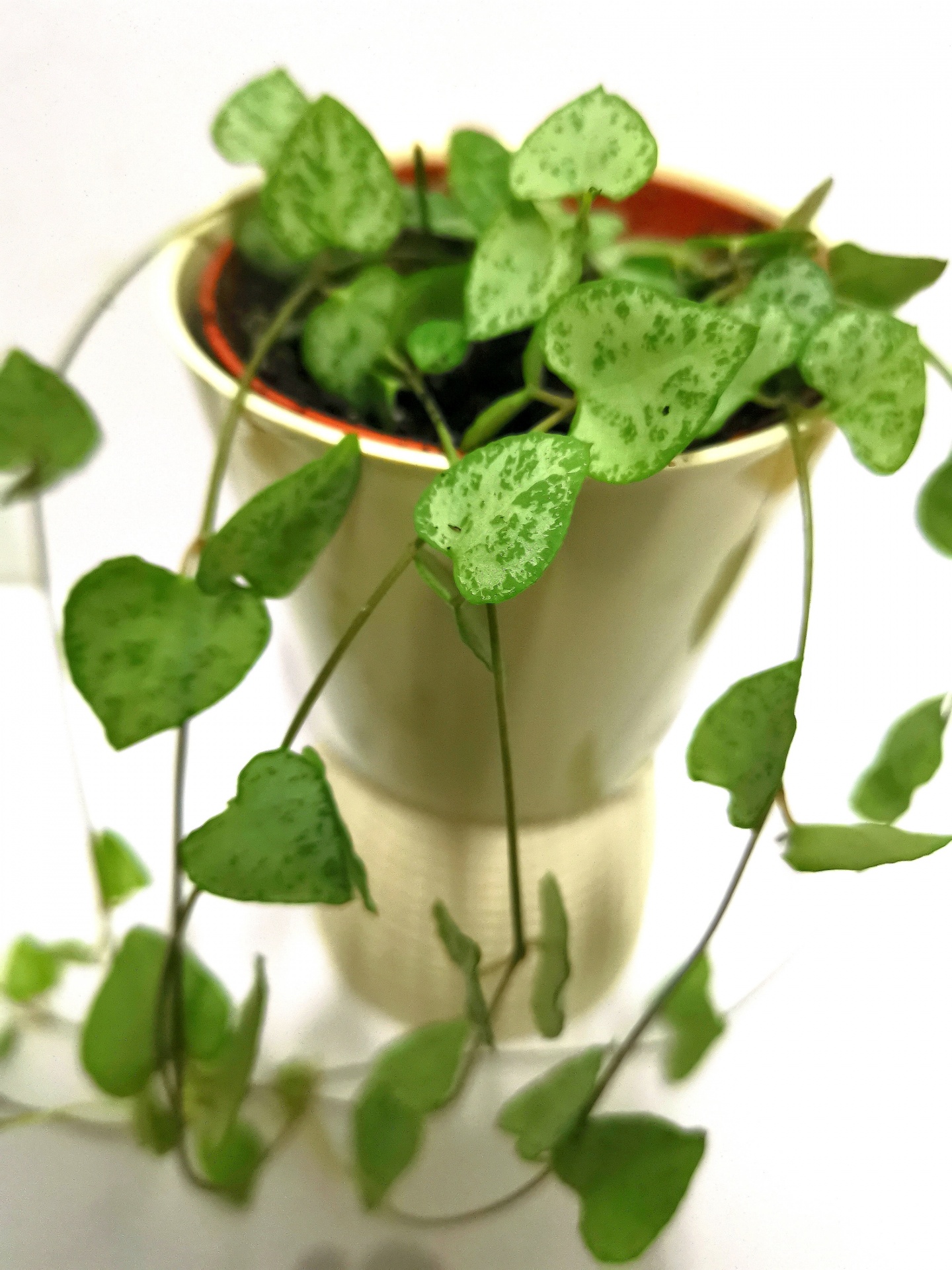 • Vaso branco com planta de folhas verdes em forma de coração