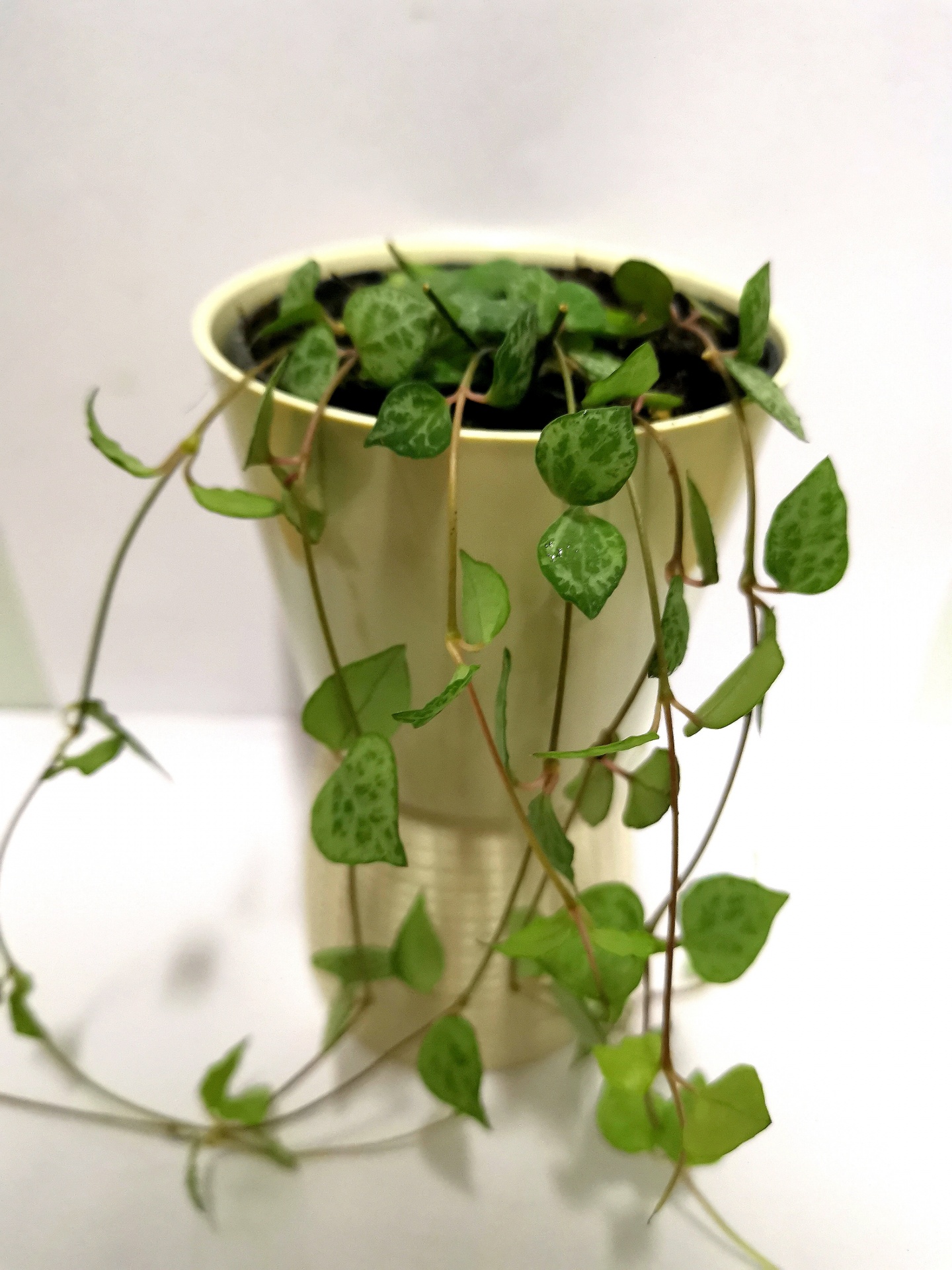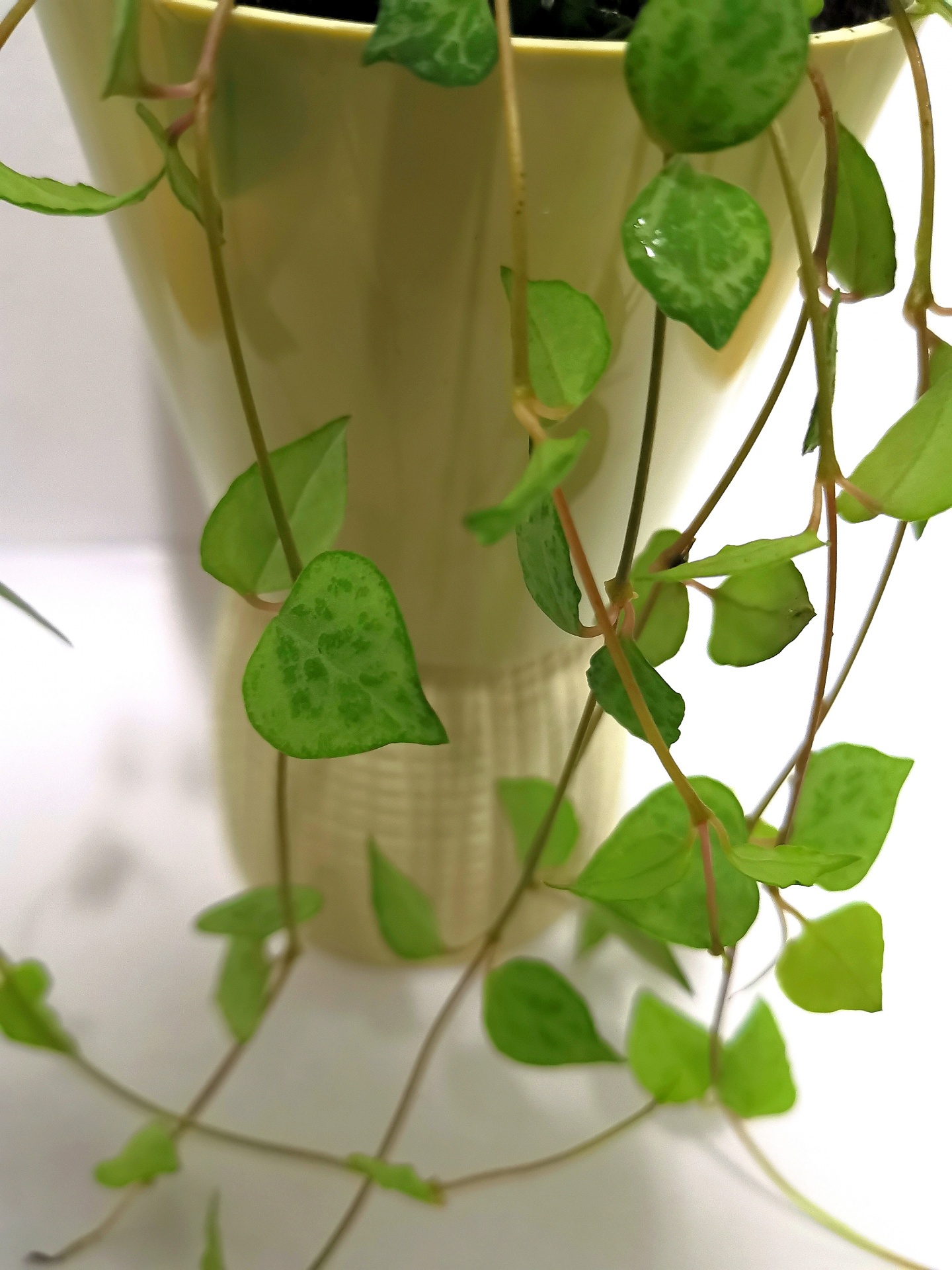 • Planta verde com folhas em forma de coração pendurada em vaso creme