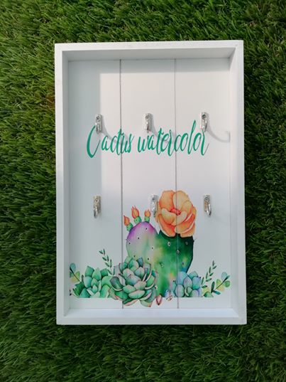 Quadro branco com ganchos e pintura de cactos em aquarela, texto 'Cactus watercolor'
