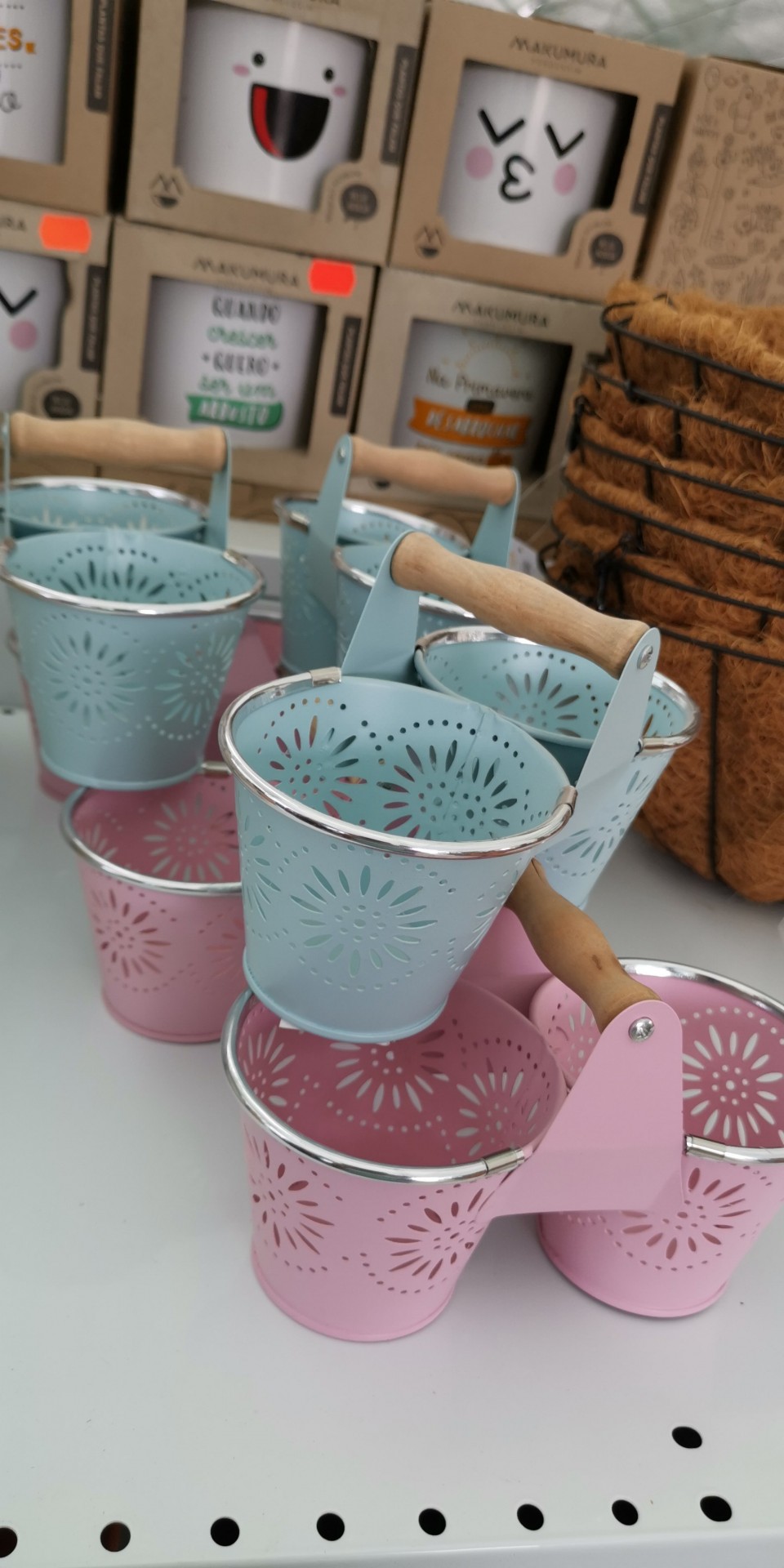 • Conjunto de baldes decorativos em azul claro e rosa com padrão floral e alça de madeira