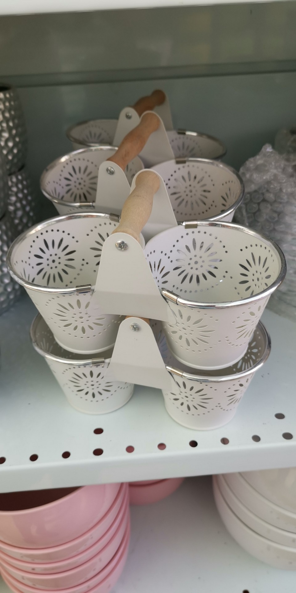 • Vasos decorativos brancos em metal com padrão floral e alça de madeira numa prateleira