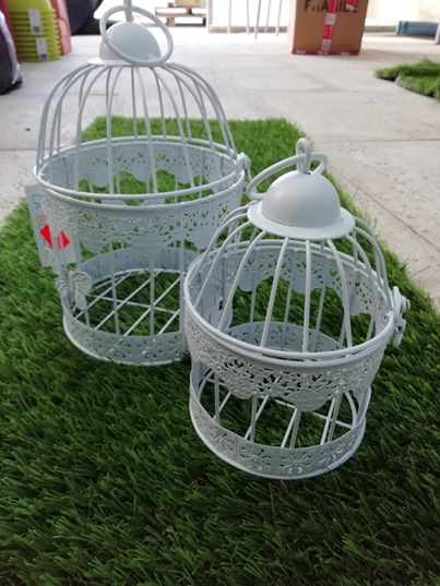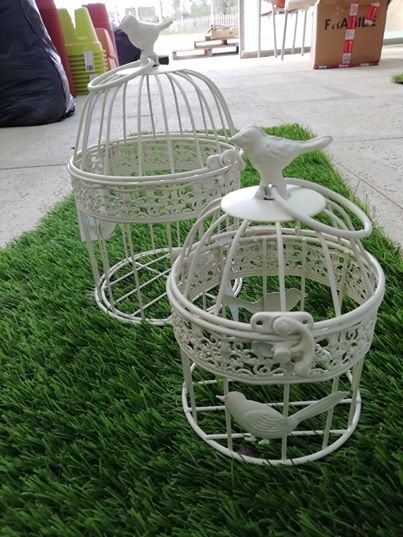 • Duas gaiolas decorativas brancas de metal sobre tapete verde semelhante a relva