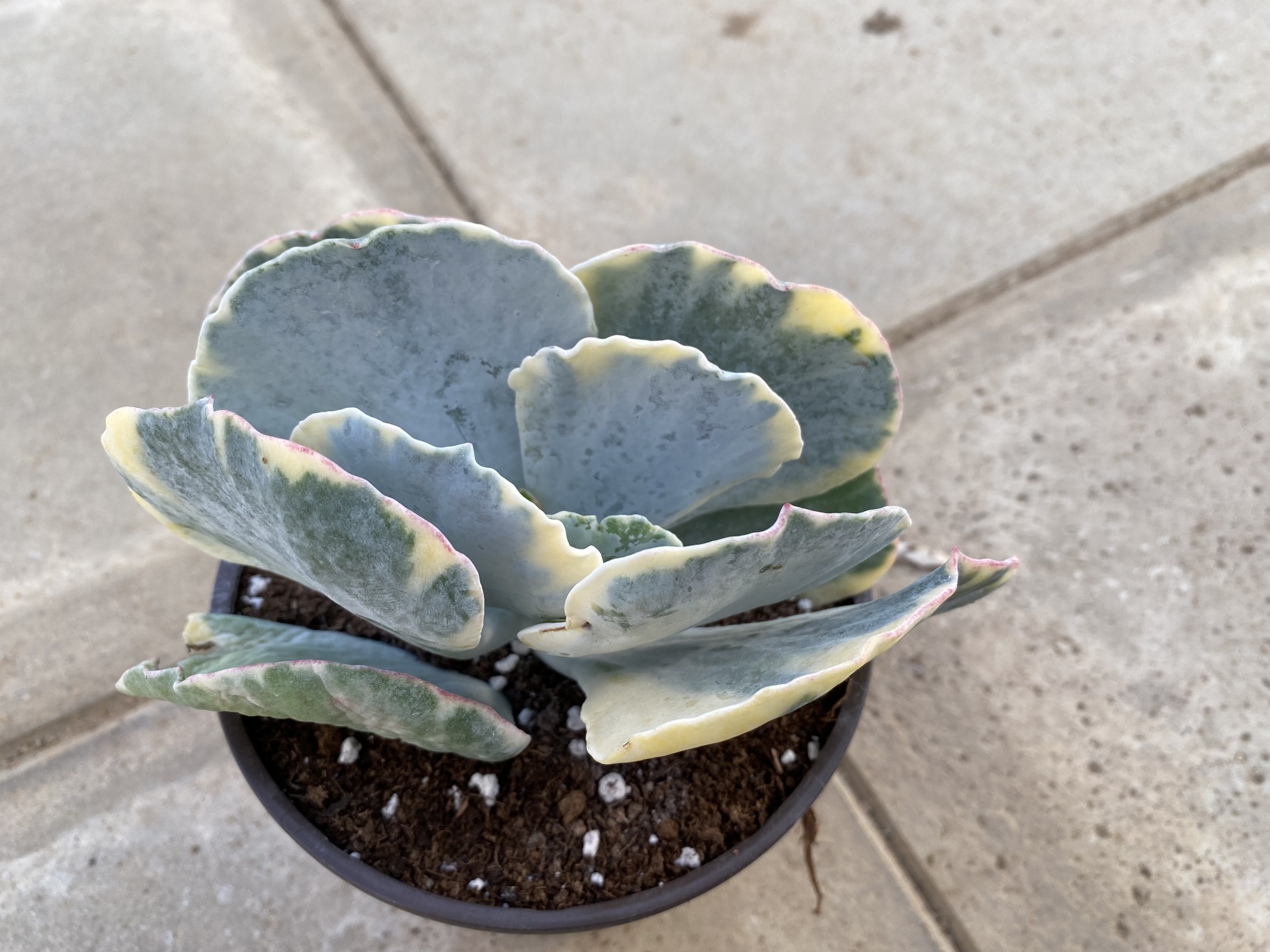 Planta suculenta em vaso preto com folhas verdes azuladas e bordas creme
