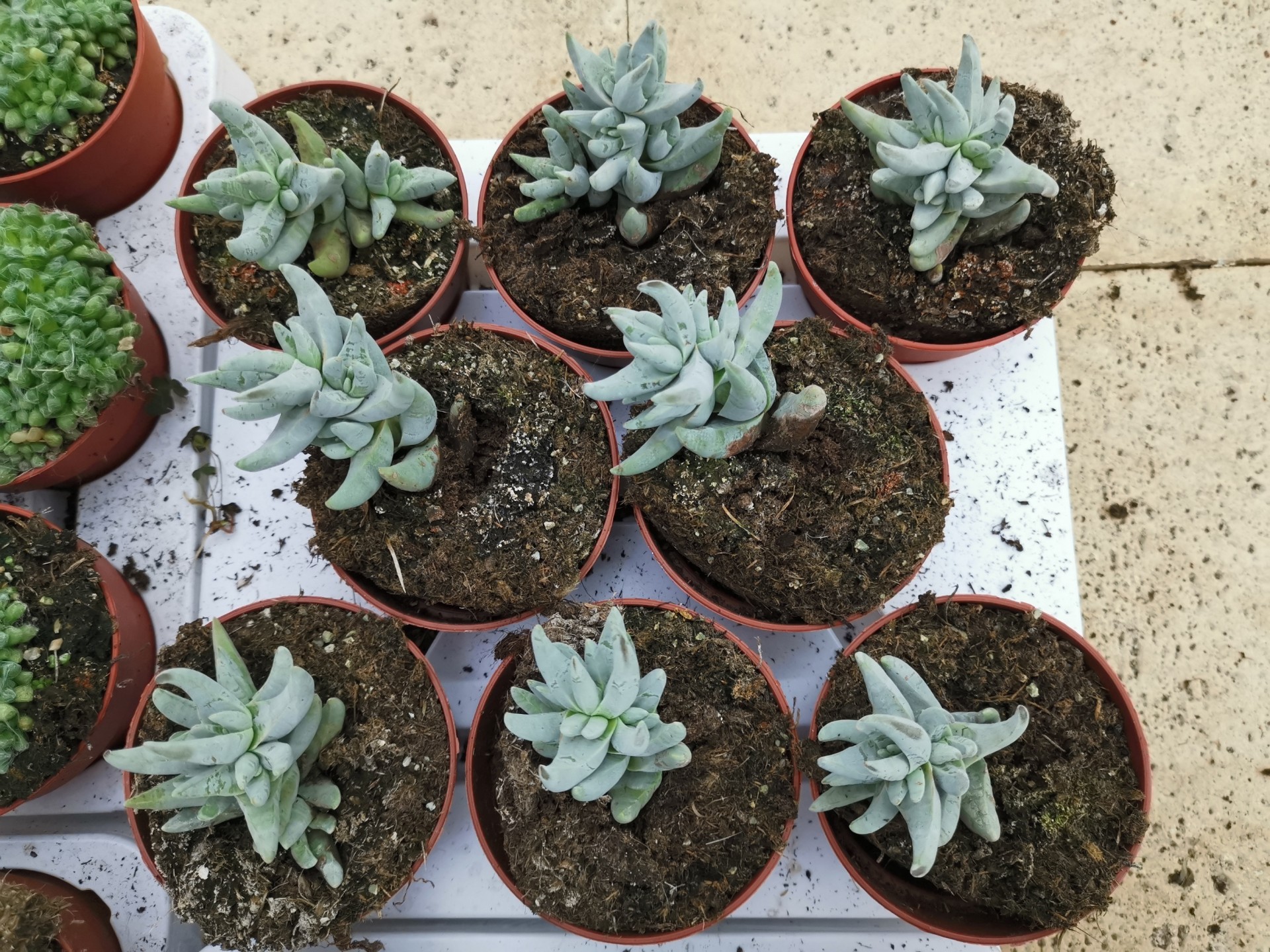Dez plantas suculentas em vasos de plástico laranja com terra, numa superfície branca sobre pavimento de pedra clara