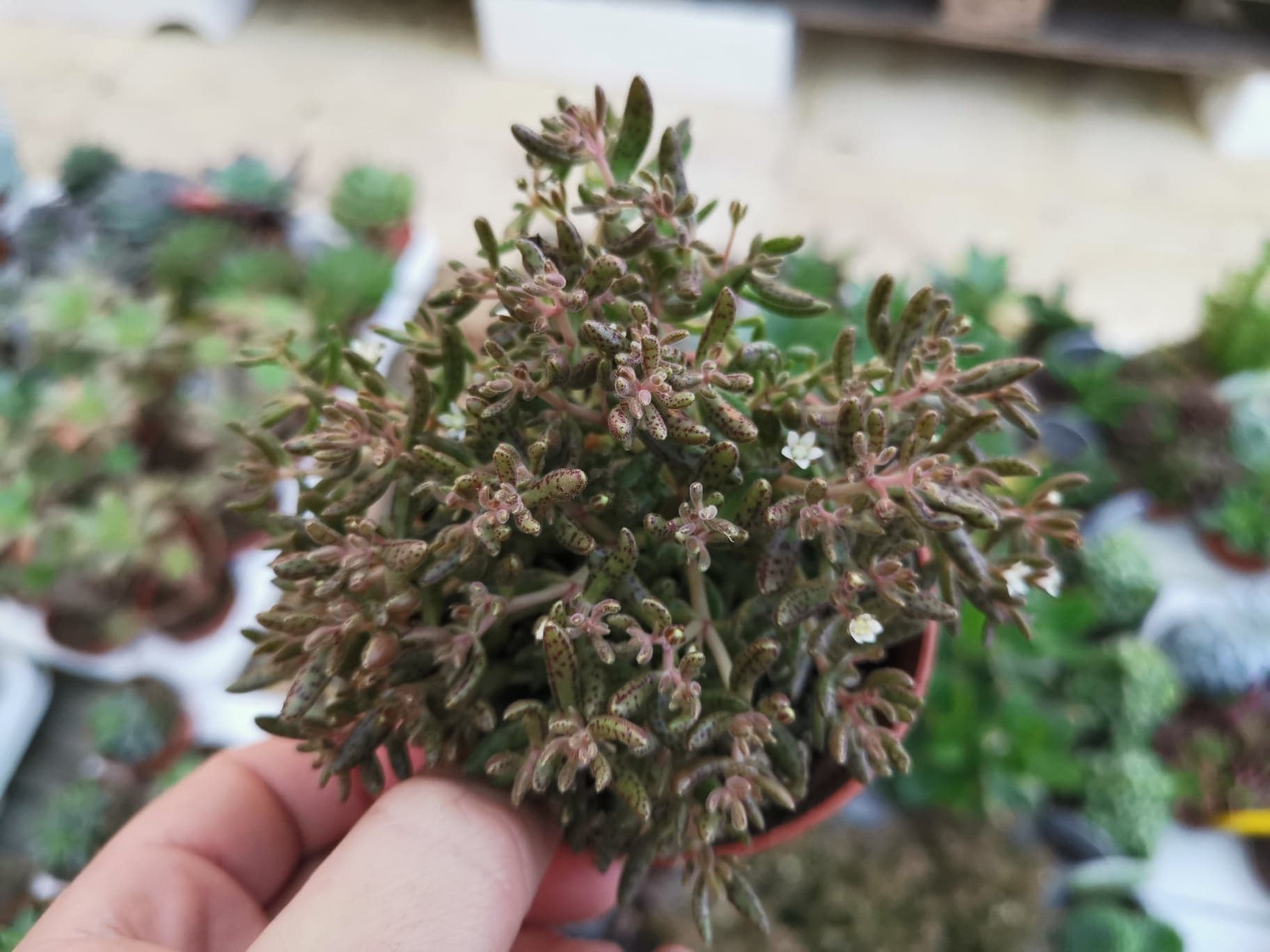 • Planta suculenta em vaso pequeno com folhas verdes acastanhadas e flores brancas