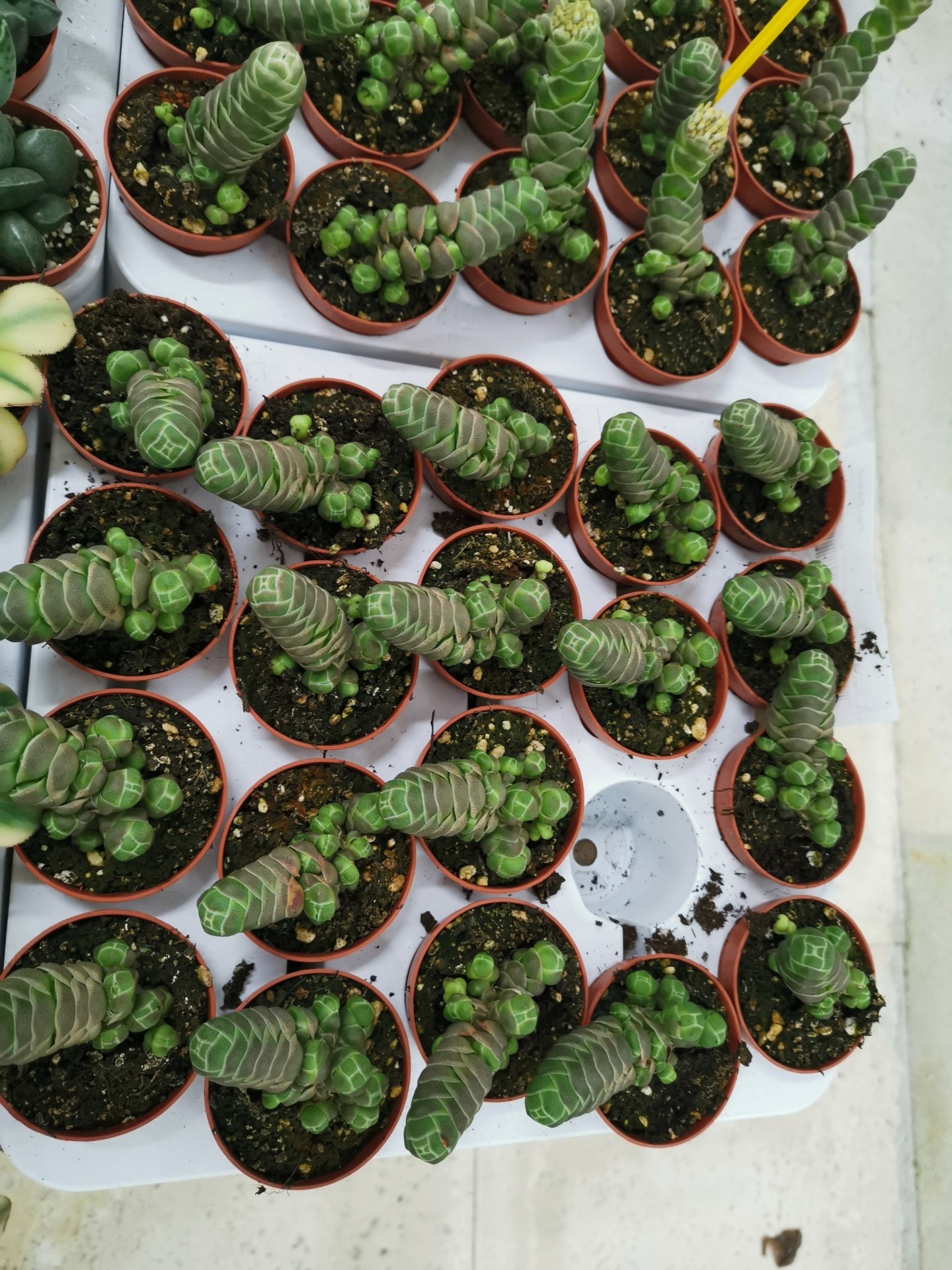 • Plantas suculentas em pequenos vasos castanhos, com padrões brancos, em bandejas brancas.