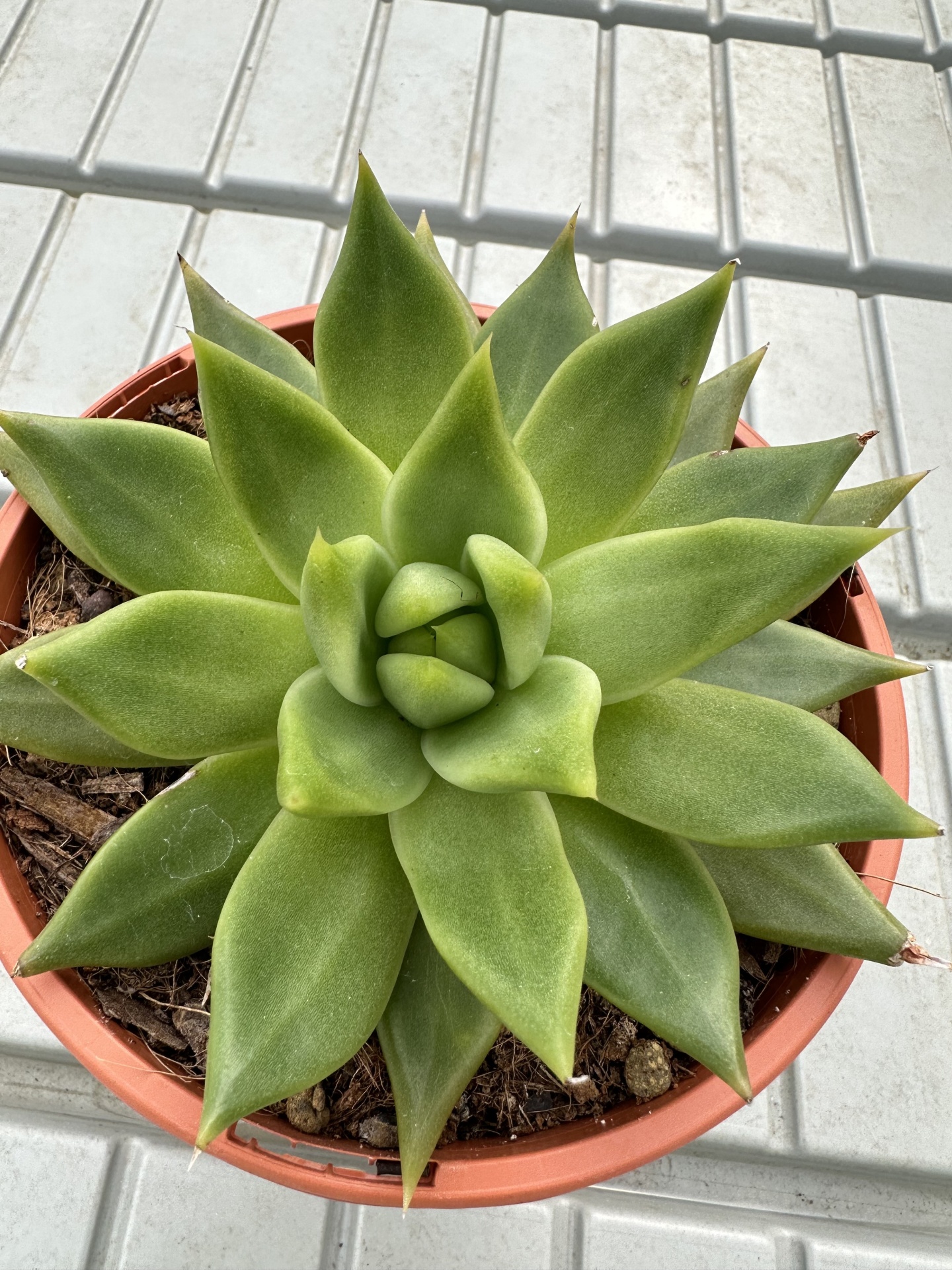 • Planta suculenta verde num vaso castanho sobre azulejos brancos