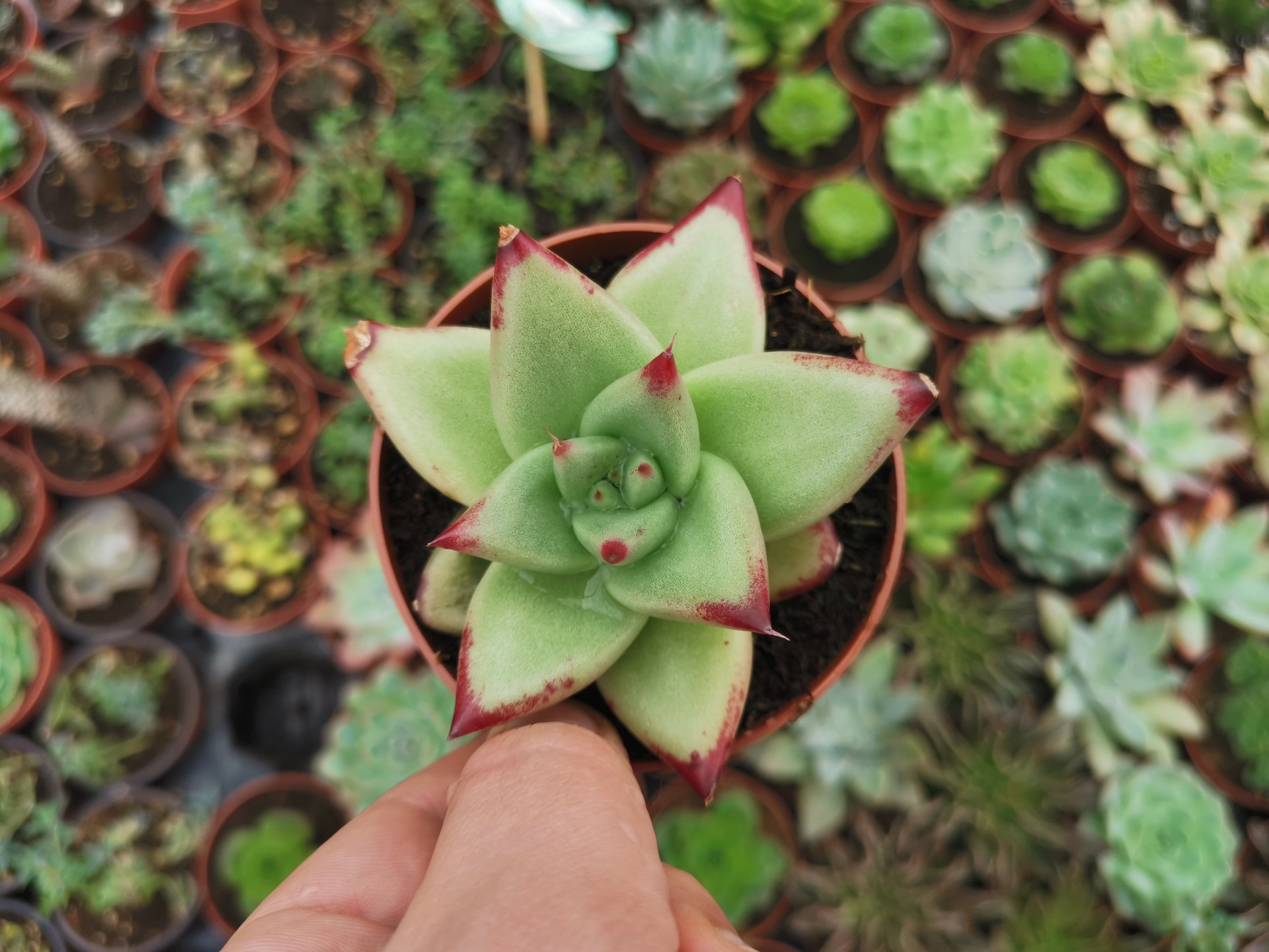 Planta suculenta verde com pontas vermelhas num vaso castanho segurado por uma mão num viveiro de plantas