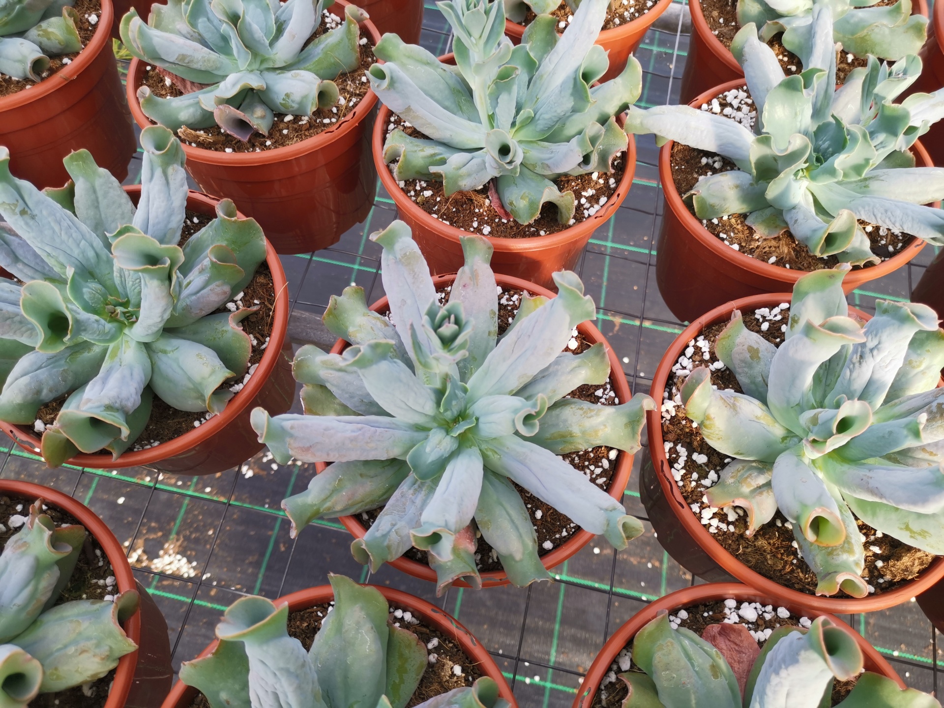 • Plantas suculentas verdes em vasos de plástico castanho sobre superfície metálica