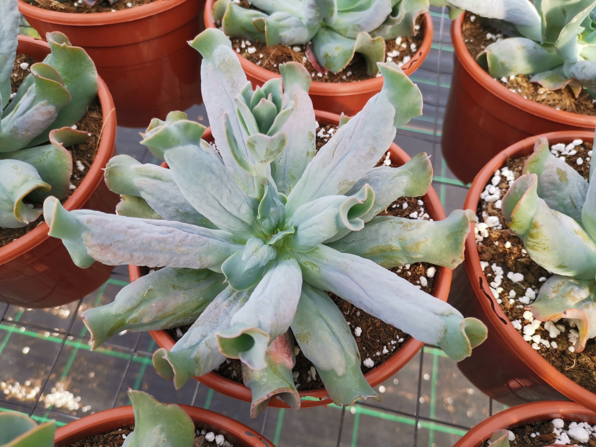 • Suculentas verdes em vasos castanhos sobre grelha preta
