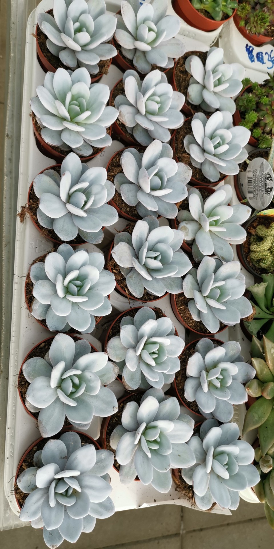 • Vasos com suculentas Echeveria azuladas em bandeja branca