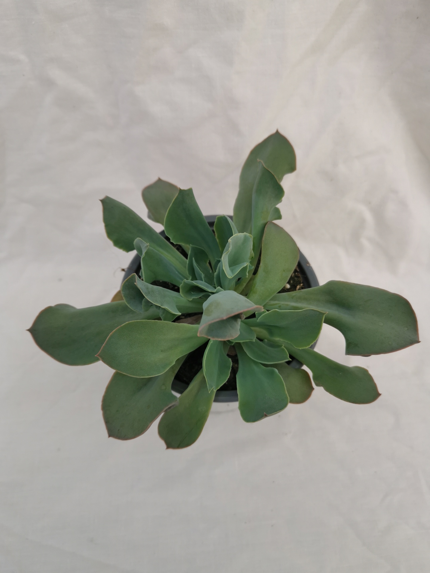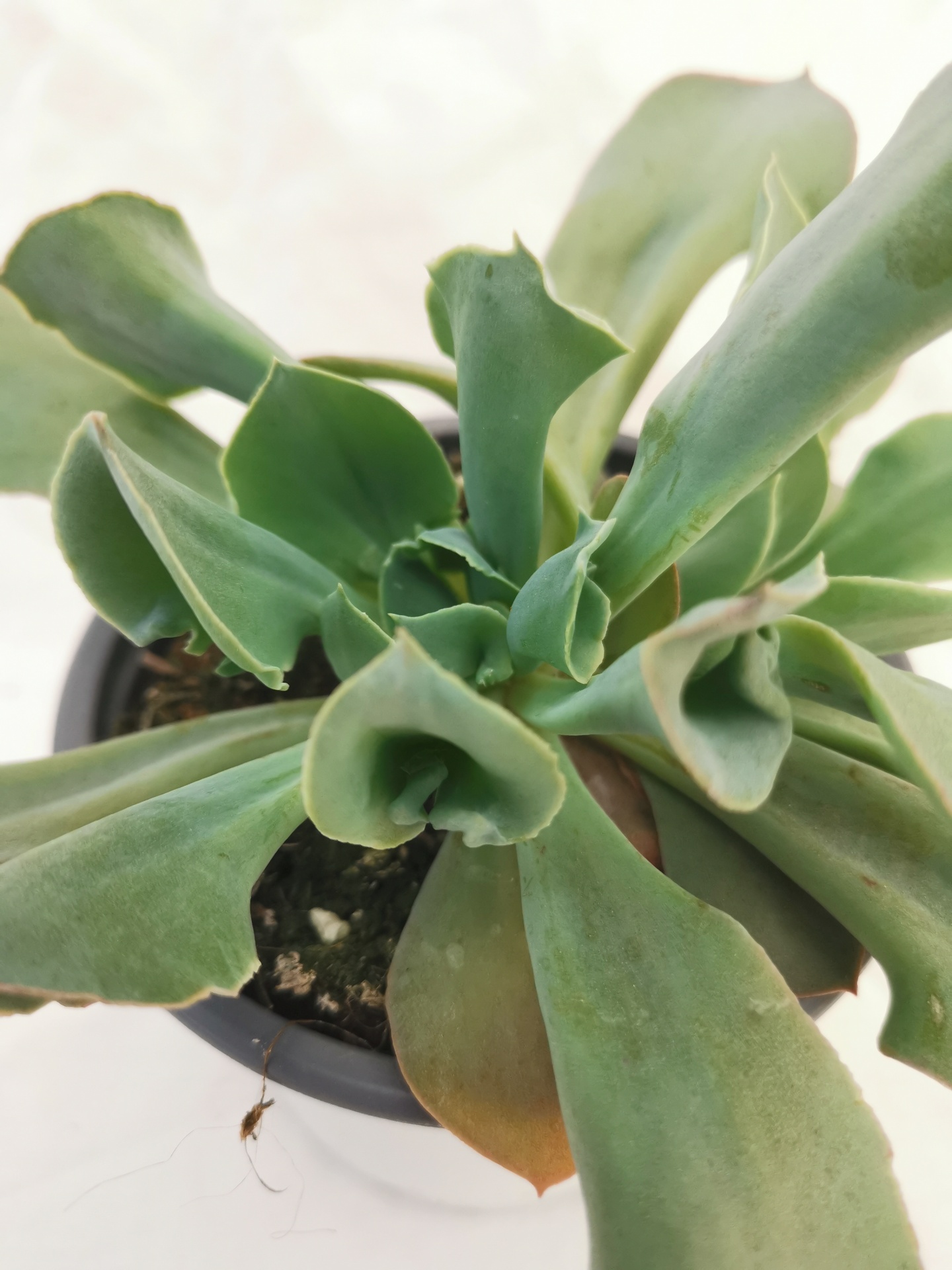 Planta suculenta verde num vaso preto vista de cima
