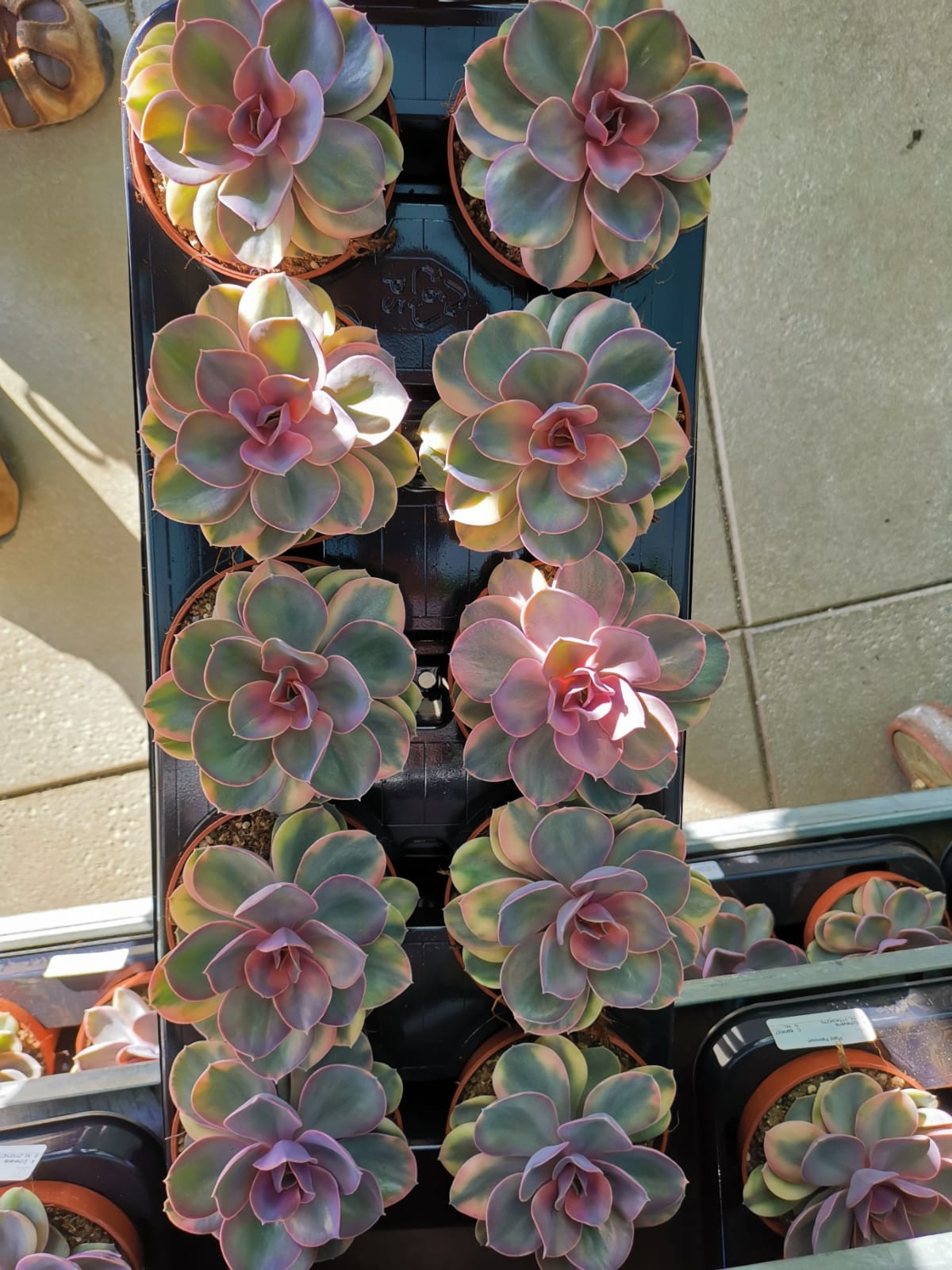 • Conjunto de 10 suculentas Echeveria em vasos de plástico castanhos, folhas verde e rosa, em bandeja preta.