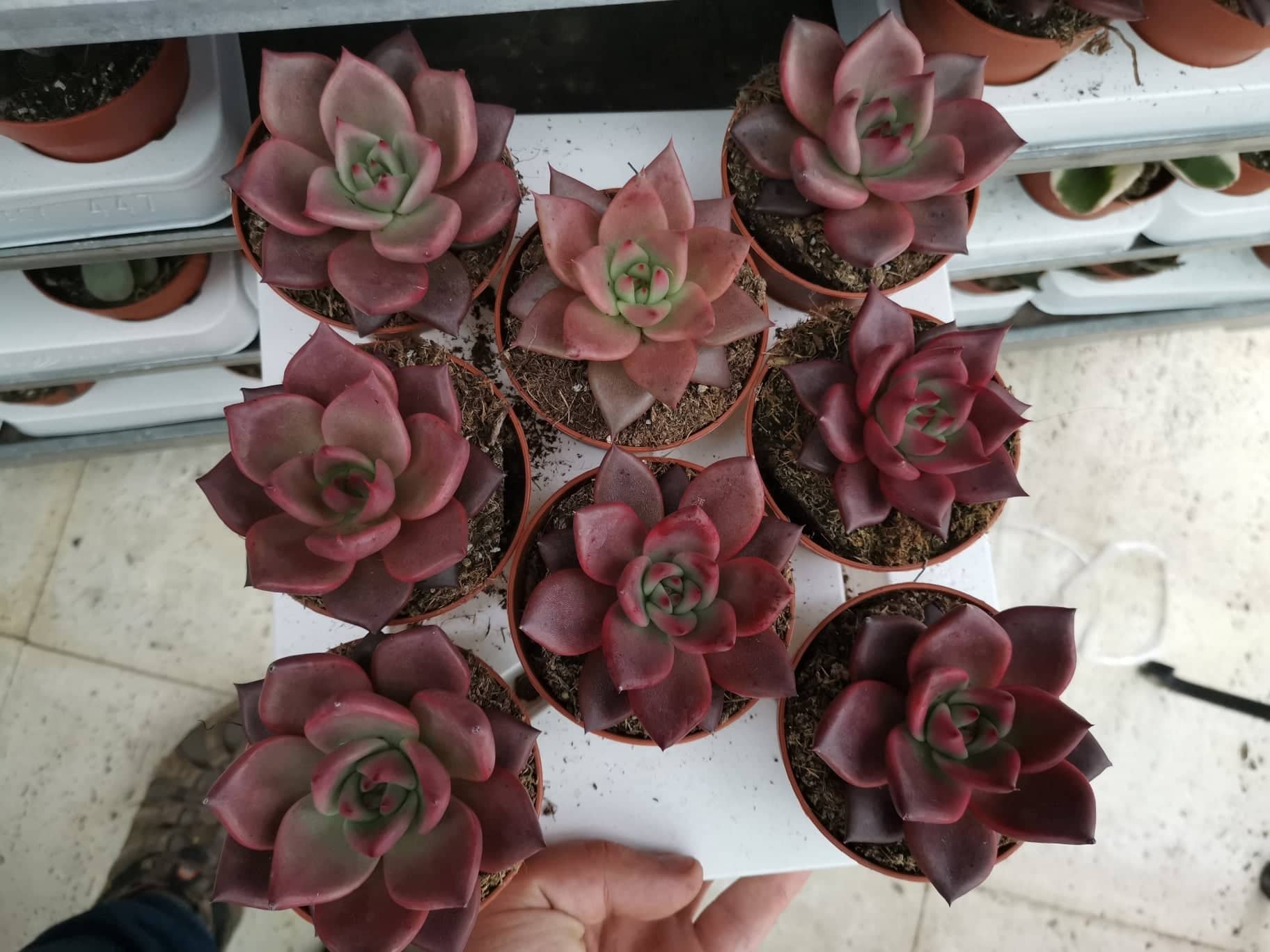• Oito pequenos vasos com suculentas vermelhas e verdes em superfície branca.