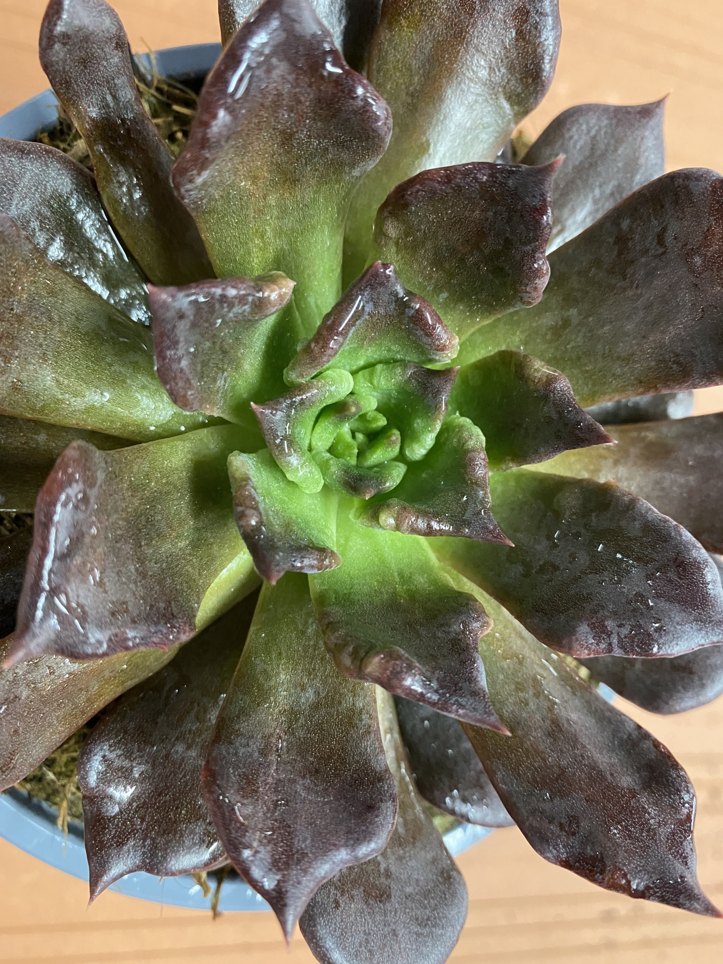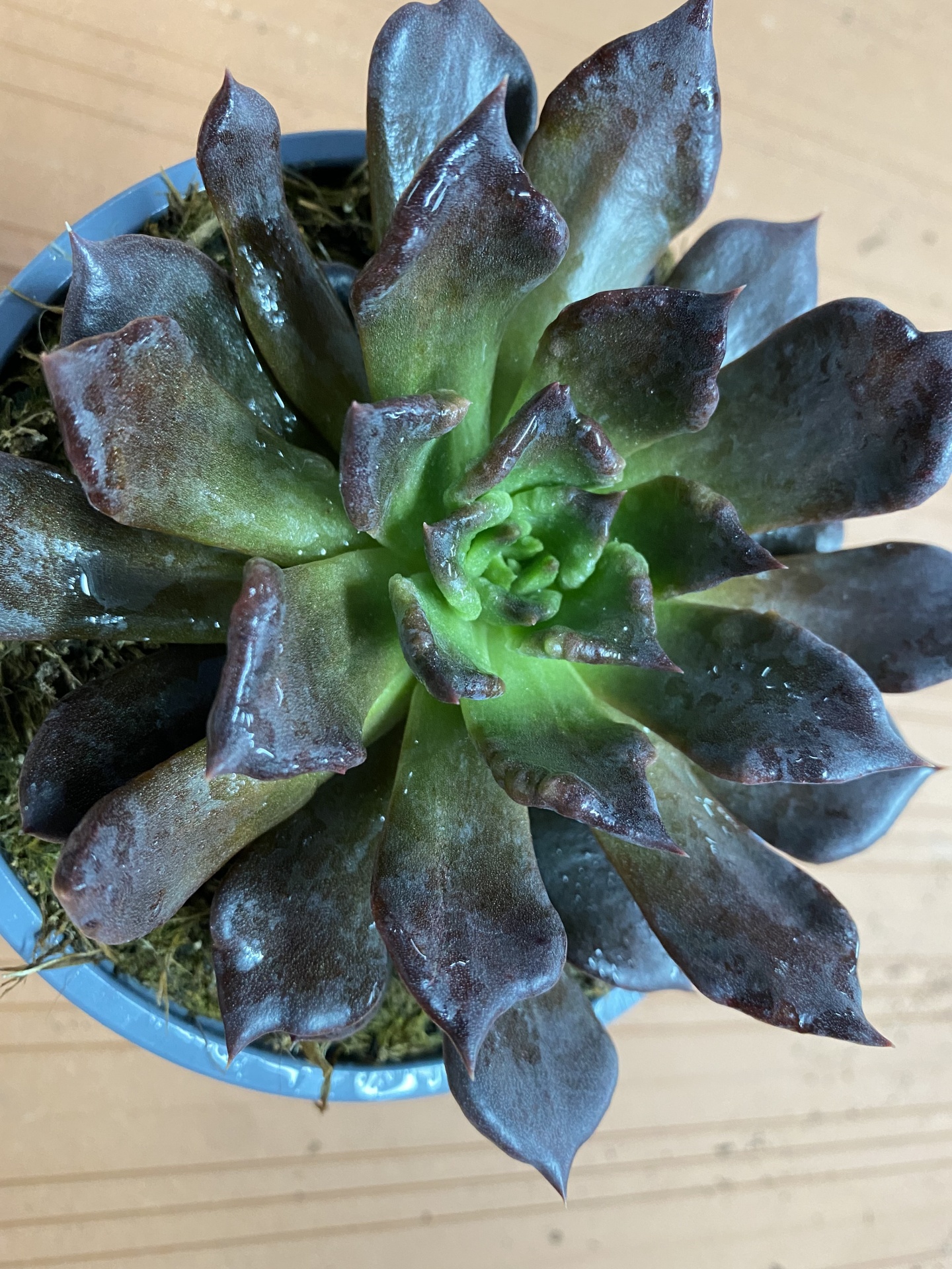 • Suculenta verde e castanho escuro num vaso azul claro sobre madeira.