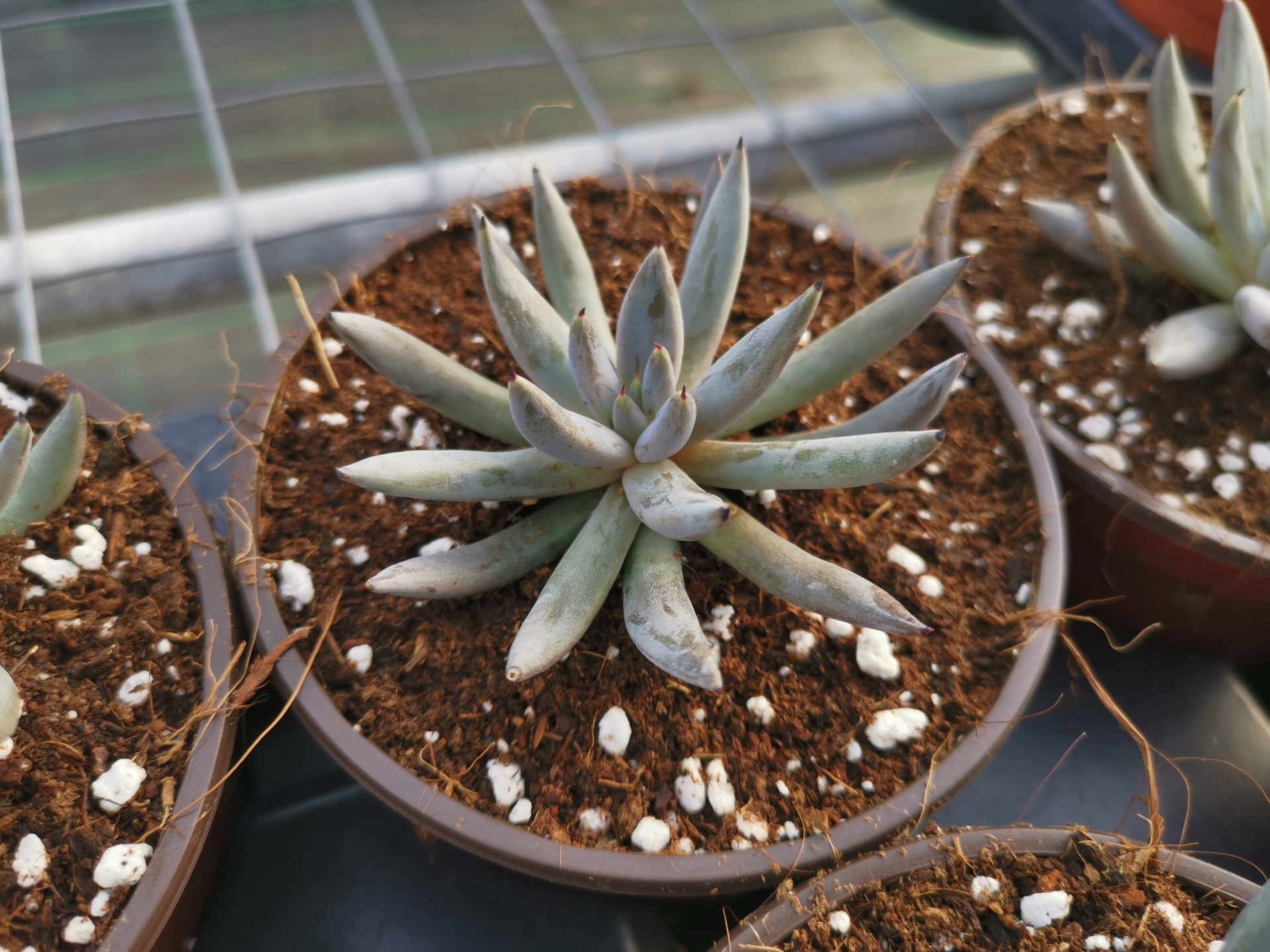 • Planta suculenta em vaso castanho com terra escura e perlita, segurada por uma mão, vários vasos ao fundo