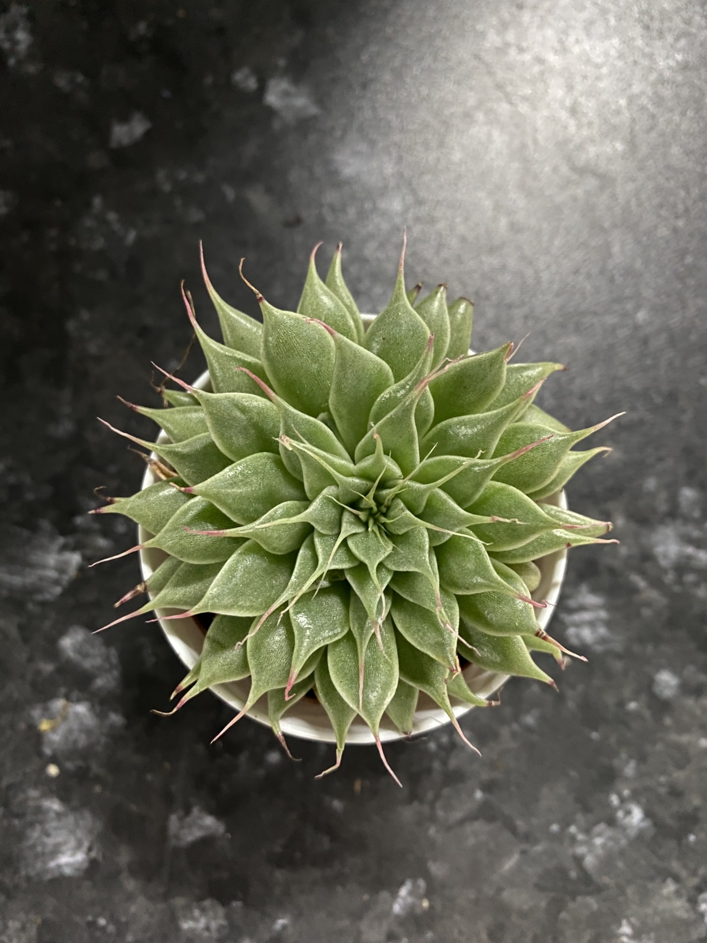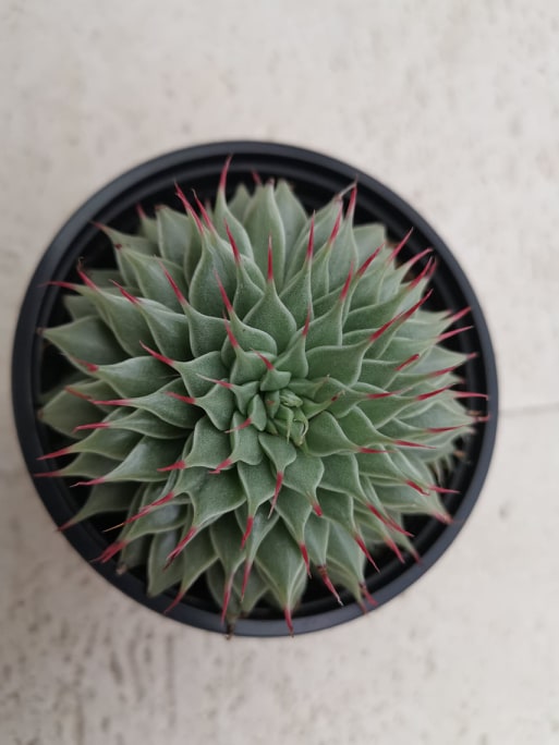 • Planta suculenta verde com pontas vermelhas num vaso preto