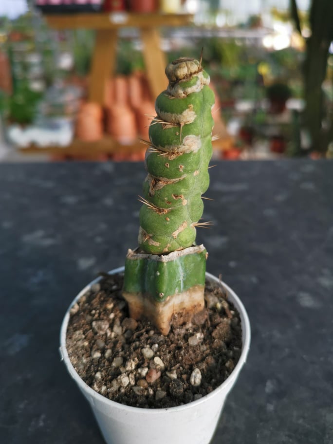 • Cacto verde com espinhos em vaso branco sobre superfície escura.