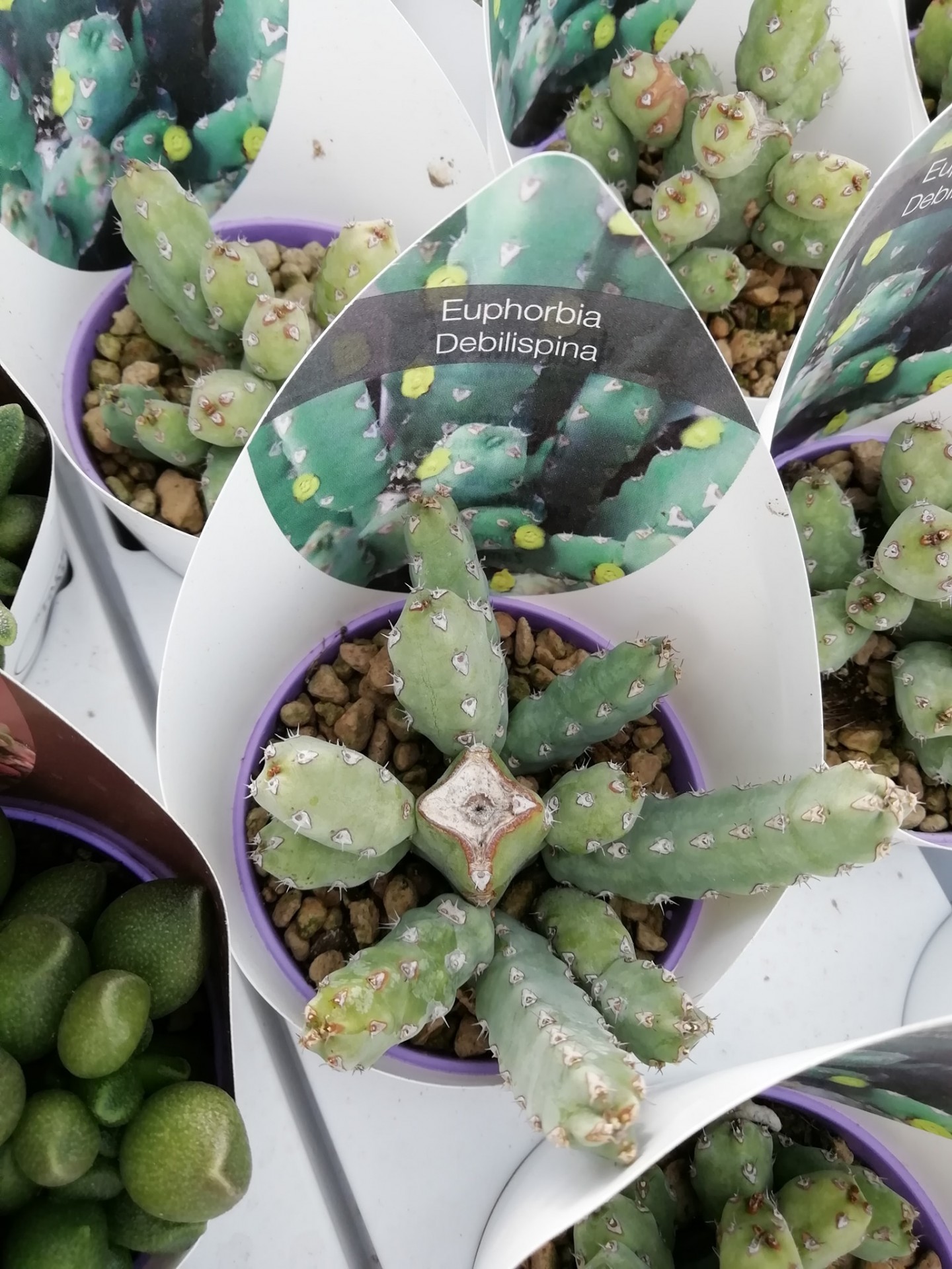 Plantas Euphorbia Debilispina em vasos roxos com etiquetas e pedras.