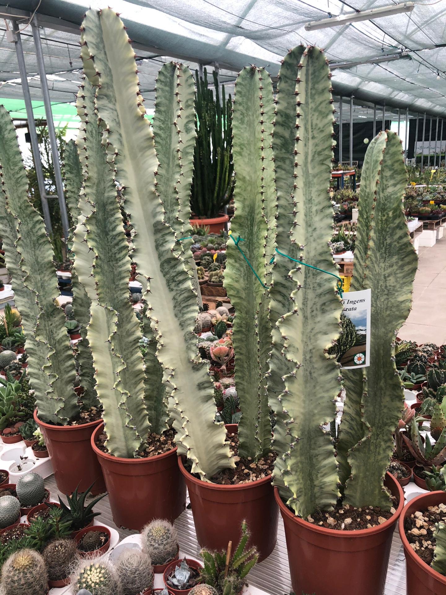 Várias plantas de cacto alto em vasos de plástico castanho numa estufa com outros cactos pequenos