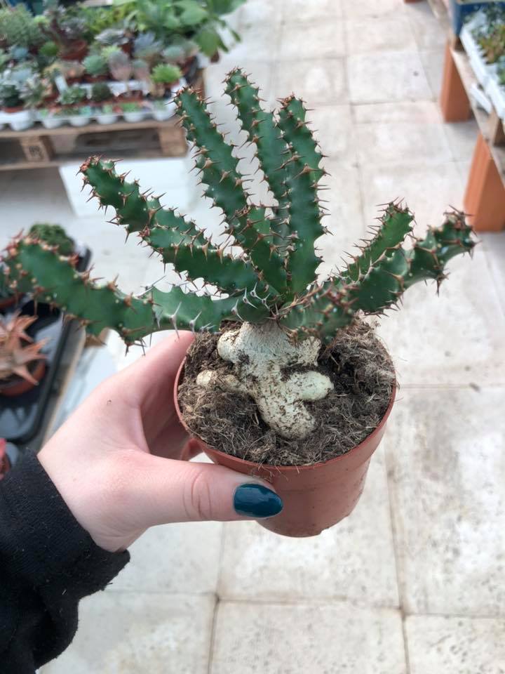 • Cacto em vaso castanho com espinhos segurado à mão em estufa