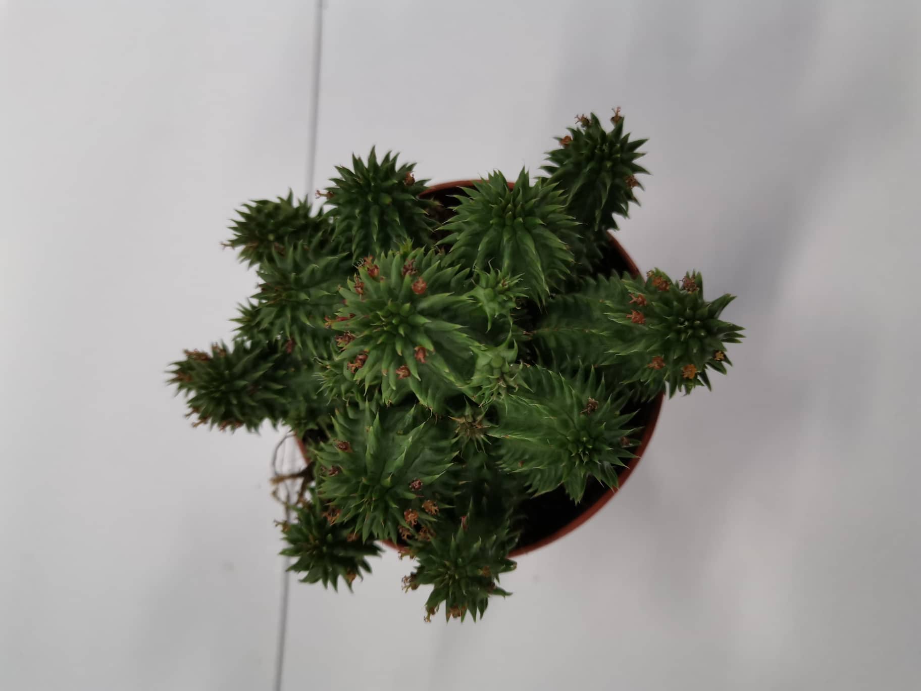 • Planta suculenta verde num vaso castanho vista de cima em fundo branco