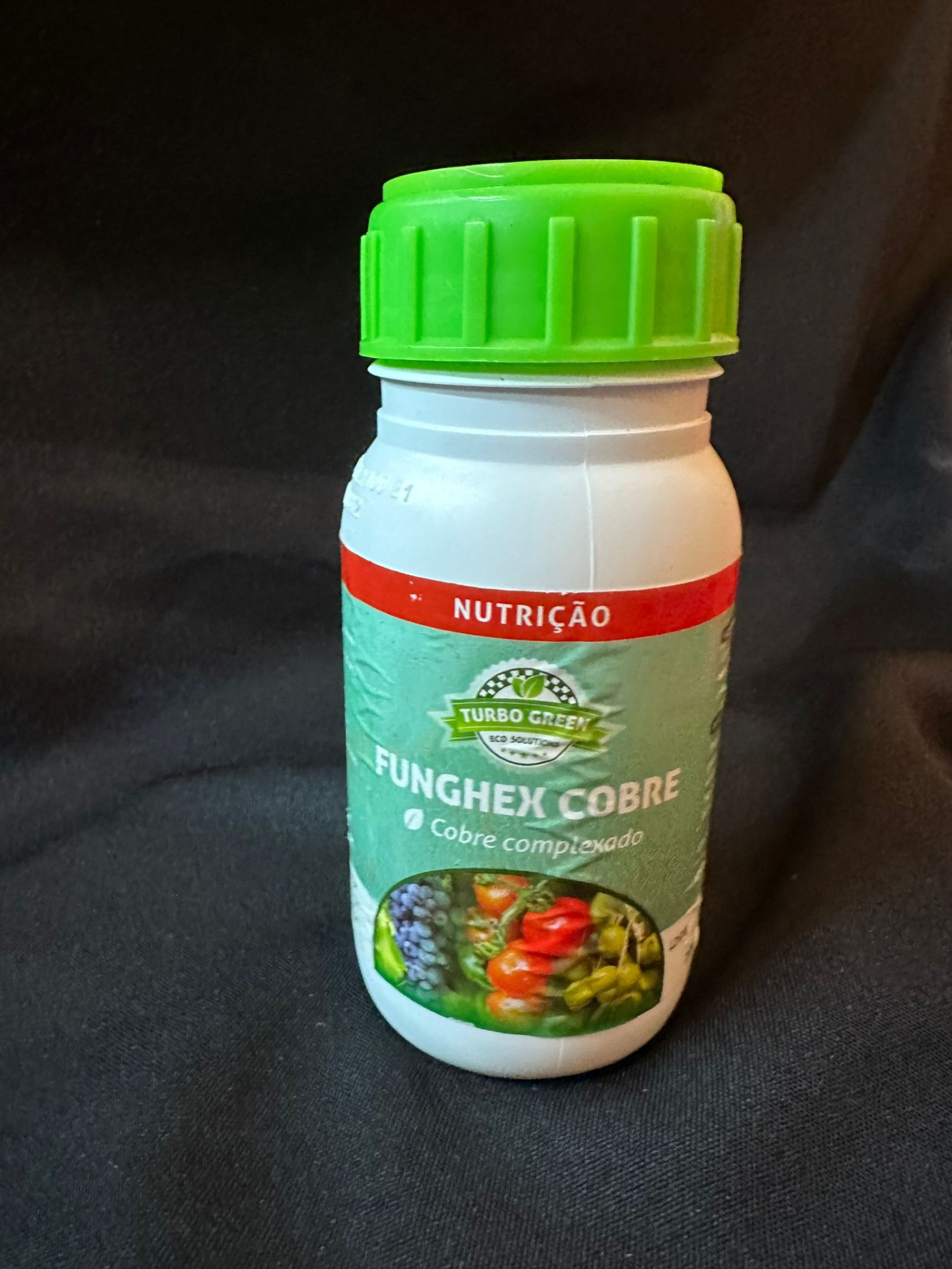 Frasco do produto Funghex Cobre com rótulo verde e vermelho e tampa verde