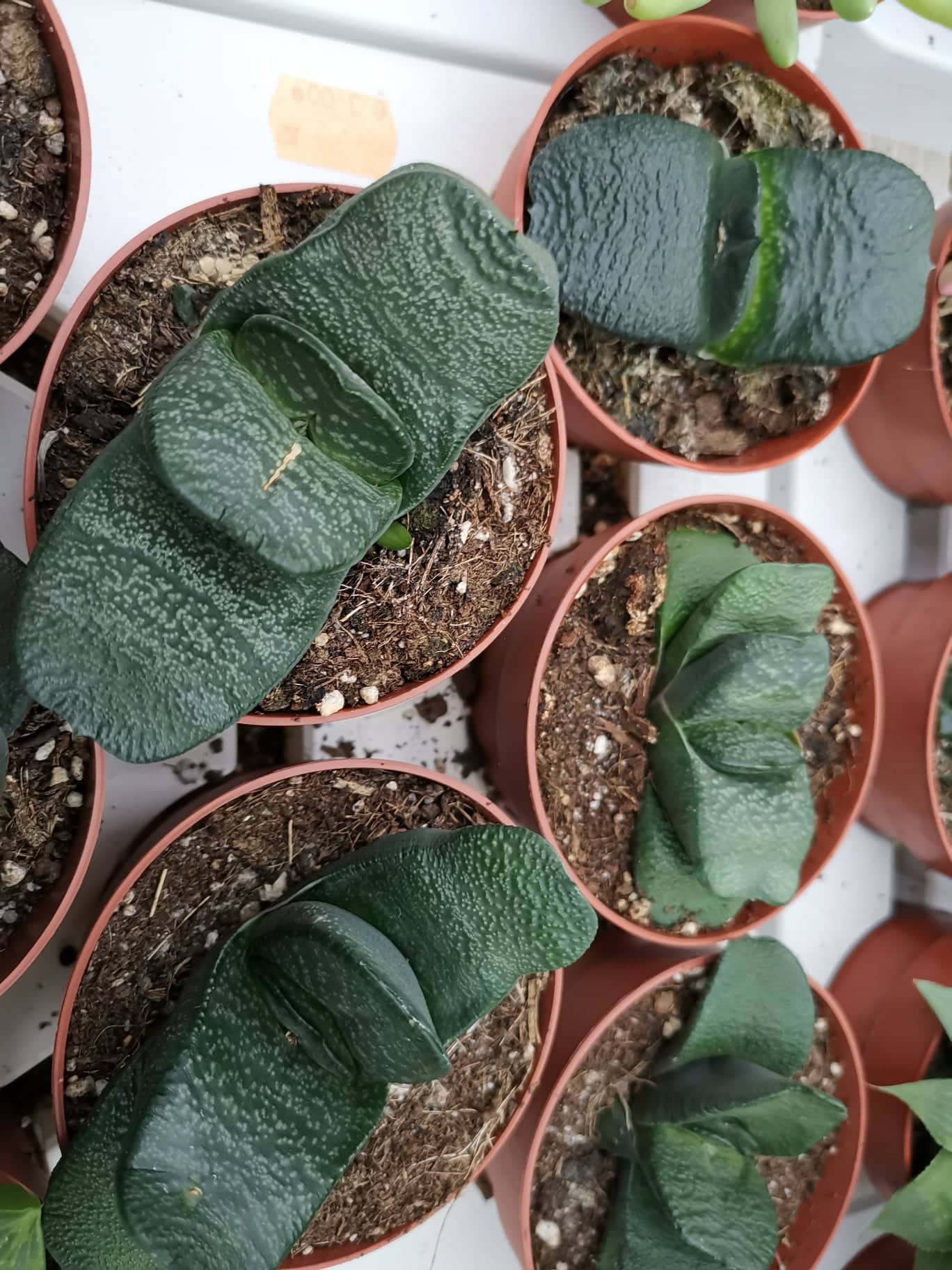 Plantinhas suculentas verdes em vasos vermelhos com terra